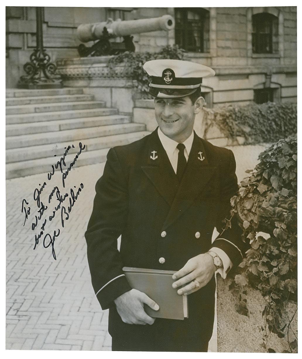 College Football Hall of Famer who won the 1960 Heisman trophy. Glossy 6.75 x 8 Associated Press photo of Bellino in his naval dress uniform, signed and inscribed in black felt tip “To Jim Wiggins with my personal best wishes, Joe Bellino.” Reverse is stamp dated December 13, 1960. In very good condition, with trimmed edges, scattered toning to image and background, and some scattered light surface marks.