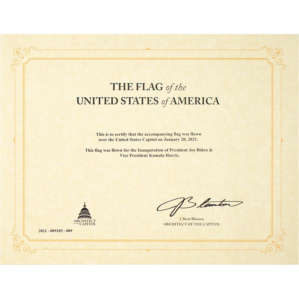 Very desirable 5´ x 3´ nylon American flag that was flown over the United States Capitol during the presidential inauguration of Joe Biden on January 20, 2021. Includes a printed presentation certificate from Architect of the Capitol J. Brett Blanton, in full: "This is to certify that the accompanying flag was flown over the United States Capitol on January 20, 2021. This flag was flown for the Inauguration of President Joe Biden & Vice President Kamala Harris.” In very fine condition. Accompanied by the original box