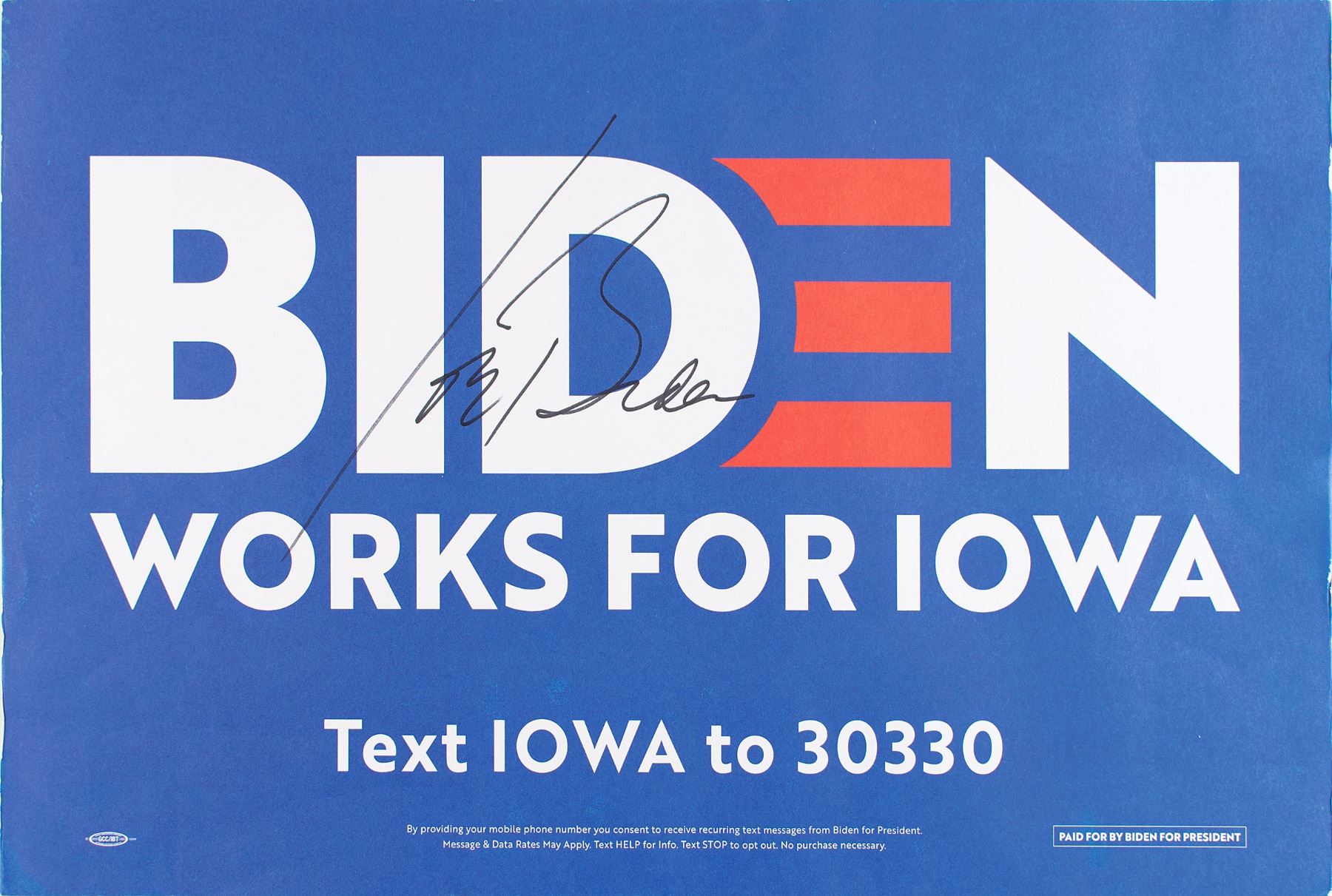Desirable campaign sign from the 2020 Democratic presidential caucuses in Iowa, 22 x 14, prominently signed in black felt tip by Joe Biden. The sign boasts the slogan, "Biden works for Iowa." In fine condition, with light creasing and some surface loss to reverse. A huge signature from the Democratic presidential nominee.