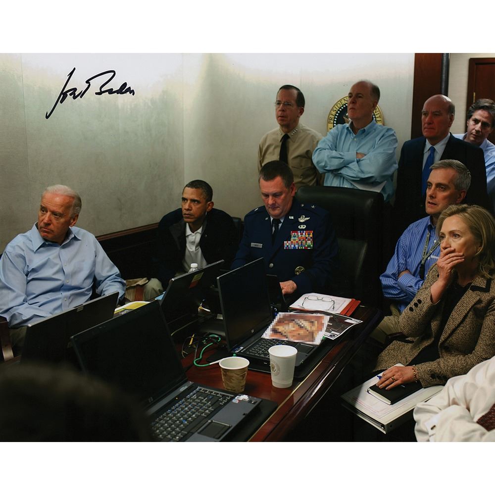 Color satin-finish 14 x 11 photo of President Barack Obama, Vice President Joe Biden, and former Secretary of State Hillary Clinton, along with other members of the national security team, as they receive an update on the mission against Osama bin Laden in the Situation Room of the White House on May 1, 2011, signed in black felt tip, "Joe Biden." In very fine condition, with a JSA label affixed to the reverse. Accompanied by a certificate of authenticity from JSA.