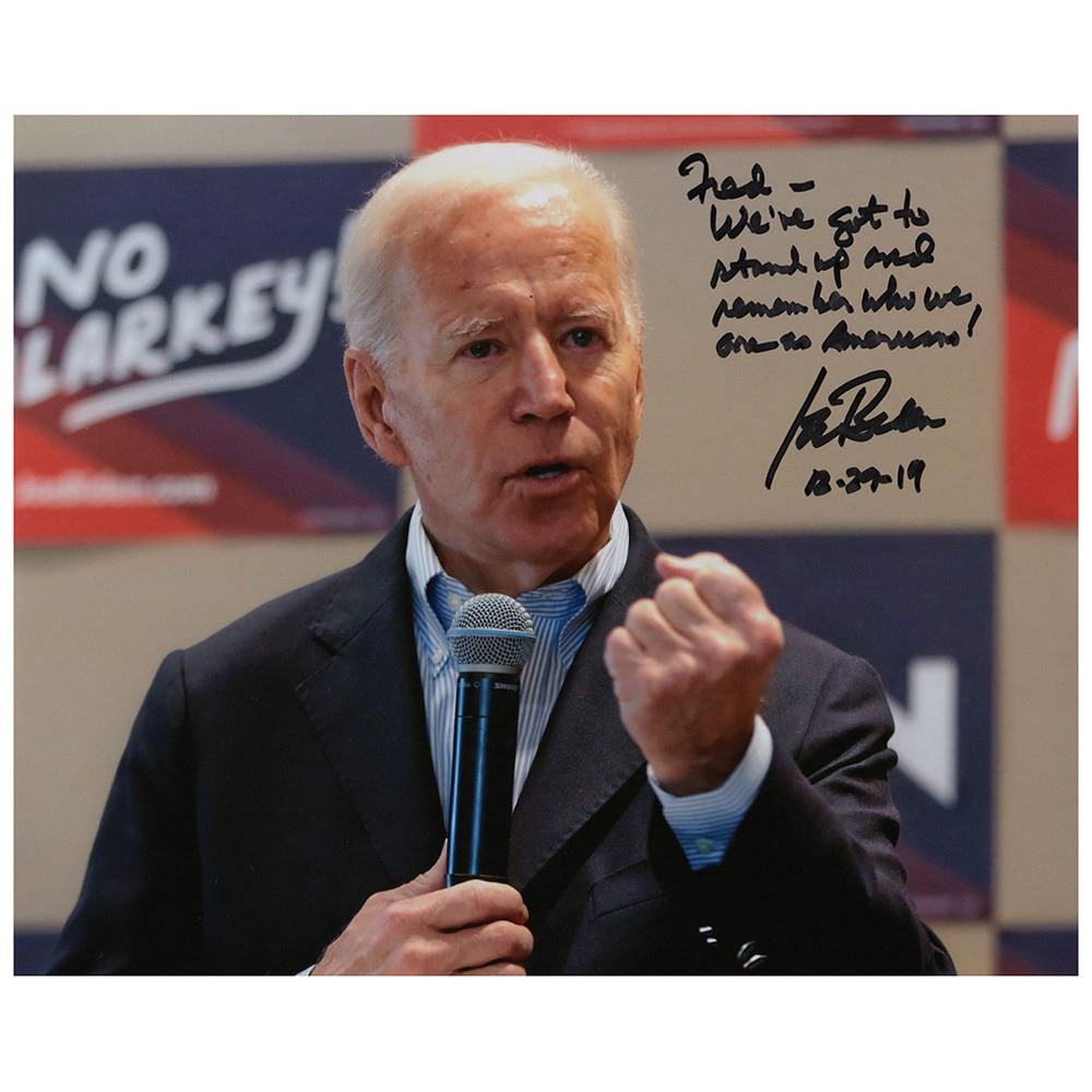 Color satin-finish 10 x 8 photo of Biden delivering a speech to his supporters, signed and inscribed in black felt tip, "Fred—We've got to stand up and remember who we are as Americans! Joe Biden, 12-29-19.†Biden quotes his presidential nomination announcement speech when he decided to run for president on 25 April 2019. In fine condition, with a few small surface creases.