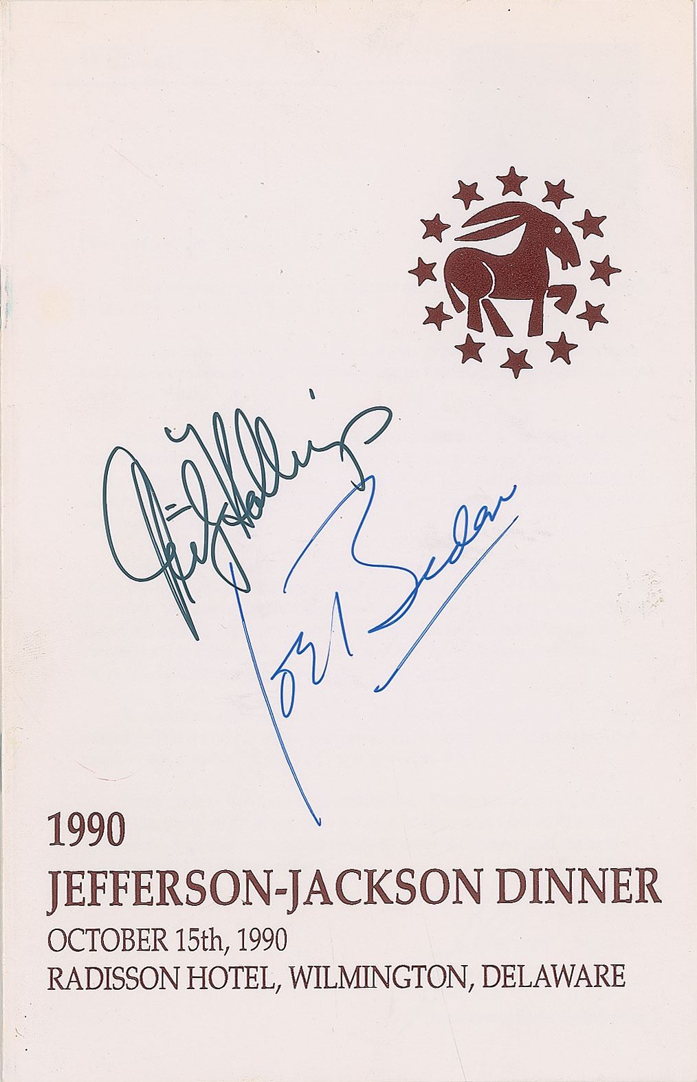 Program for the 1990 Jefferson–Jackson Dinner in Wilmington, Delaware, eight pages, 5.5 x 8.5, signed on the front cover in felt tip by Joe Biden and Fritz Hollings. In fine condition.