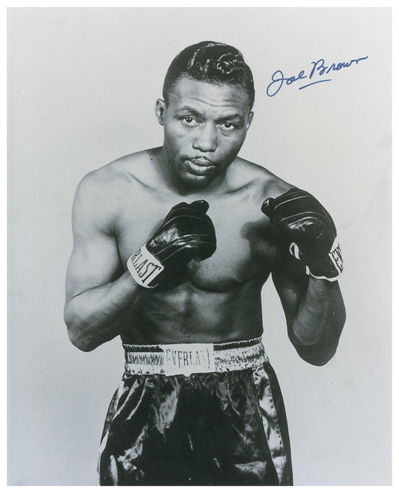 Lightweight champion of the world from 1956-1962, making 11 successful defenses before losing his crown to Carlos Ortiz. Glossy 8 x 9.75 photo of Brown holding up his fists, signed in blue felt tip. In fine condition, with a lightly trimmed bottom edge.
