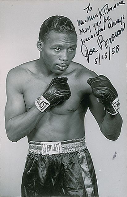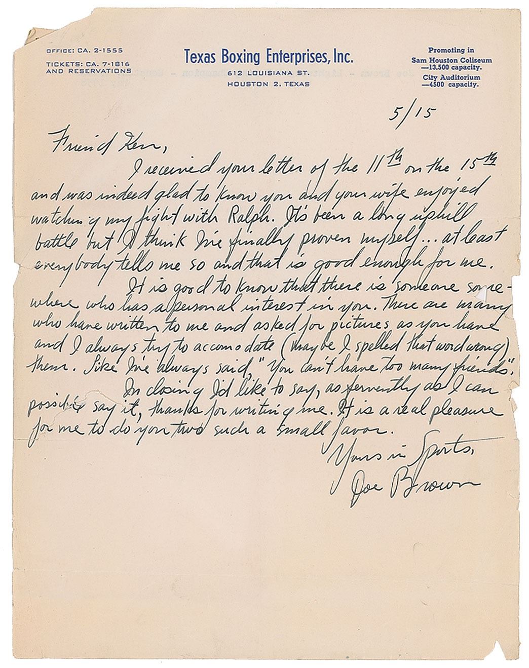 Two items: a vintage glossy 3.5 x 5.5 photo of Brown in his Everlast gear, signed and inscribed in fountain pen, "To Mr. & Mrs. Ken Browne, May you be successful always, Joe Brown, 5/15/58"; and an ALS, one page, 8.5 x 11, Texas Boxing Enterprises letterhead, May 15, [1958], in part: "Glad to know you and your wife enjoyed watching my fight with Ralph. It's been a long uphill battle but I think I've finally proven myself… at least everybody tells me so and that is good enough for me. It is good to know that there is someone somewhere who has a personal interest in you." In very good to fine condition, with creasing, tears, and chips to the letter, and surface impressions to the photo from typed notations on the back. Accompanied by the original mailing envelope.