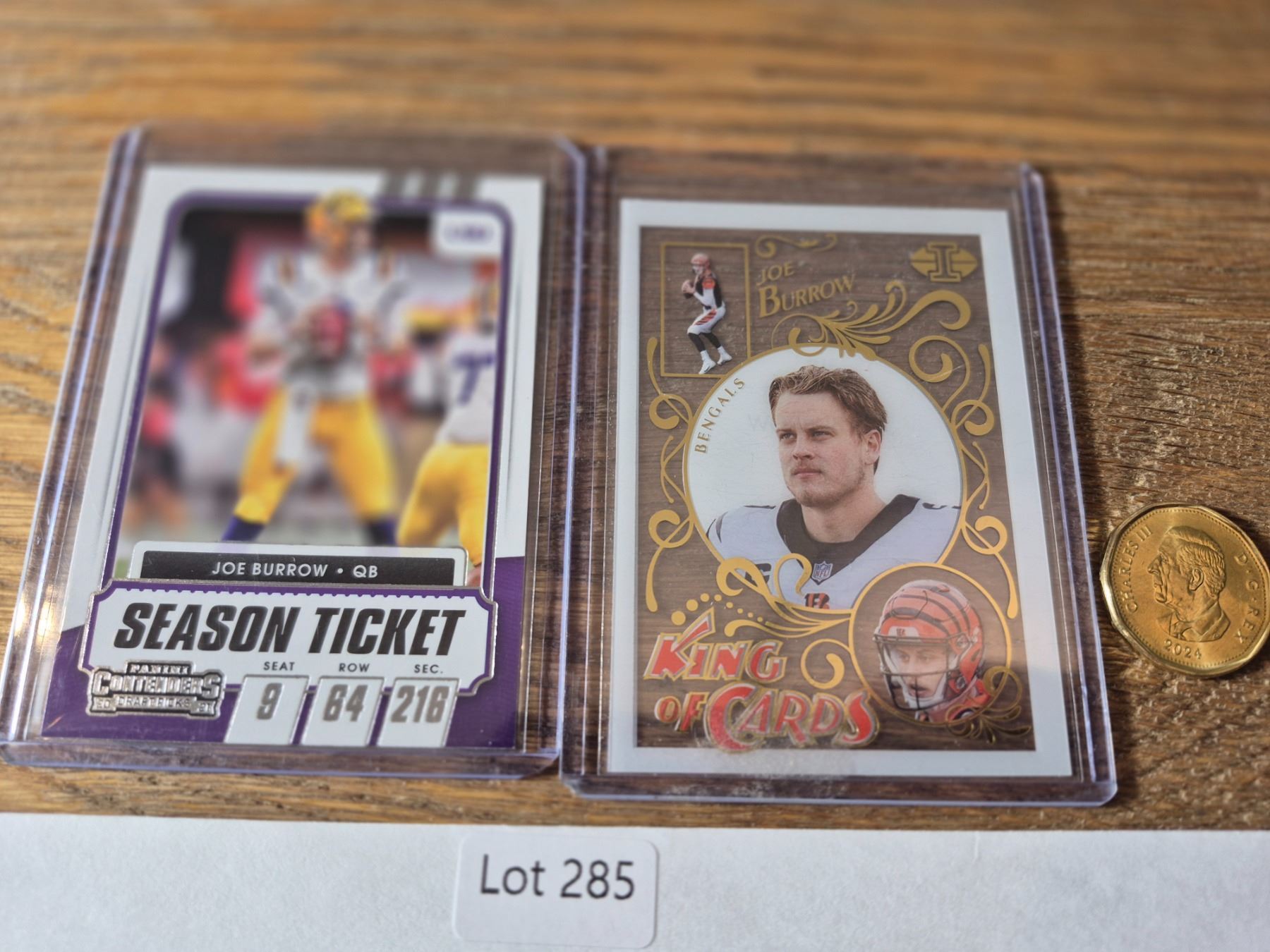 Two-card lot featuring Bengals QB Joe Burrow. Includes 2021 Panini Illusions “King of Cards” insert and 2021 Contenders Draft Picks “Season Ticket” LSU card.