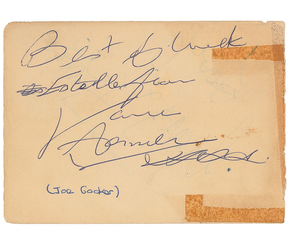 Vintage circa 1963 ballpoint signature and inscription using his early stage name, “Best of luck Estelle, from Vance Arnold xxxx,” on an off-white 5.25 x 3.75 album page. In very good condition, with toned tape remnants to the right side and scattered soiling. Accompanied by a certificate of authenticity from Tracks.