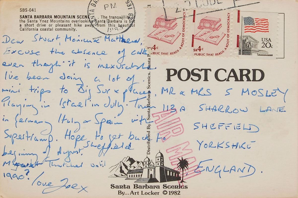 ALS signed “Love, Joe, x,” one page on the reverse of a 6 x 4 postcard showing a lovely scene of the Santa Ynez mountains, postmarked 1983. Letter to fellow Sheffield musician Stuart Mosley and his family, in full: “Excuse the absence of calls even though it is inexcusable. I’ve been doing a lot of mini trips to Big Sur + places. Playing in Israel in July. Then in Germany, Italy or Spain with Supertramp. Hope to get back to Sheffield beginning of August. Margaret Thatcher until 1990?” In fine condition, with light toning along edges.