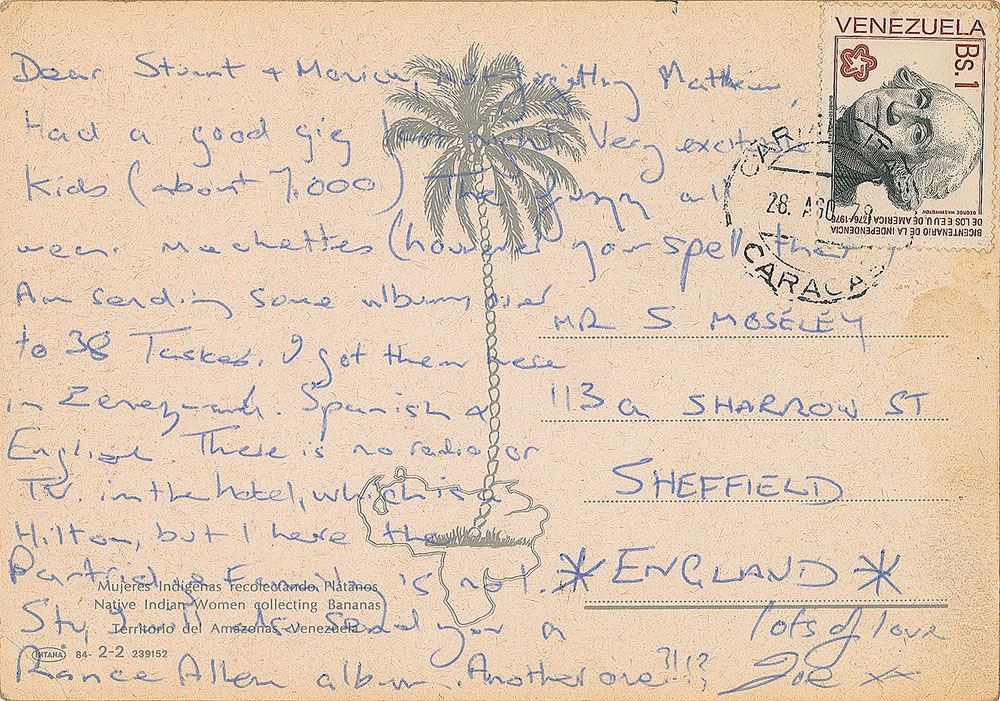 ALS signed “Joe, xxx,” one page on the reverse of a 5.75 x 4 postcard, postmarked Carmelitas, Caracas, August 28, 1979. Letter to Stuart Moseley, a musician and friend in his hometown of Sheffield, in part (grammar and spelling retained): "Had good gig last night. Very excitable kids (about 7,000). The fuzz all wear machettes (however you spell that). Am sending some albums over to 38 Taskes…There is no radio or T.V. in the hotel, which is Hilton, but I here the Partridge Family is no. 1. Stu, I will also send you a Rance Allen album. Another one?!!?" In fine condition.