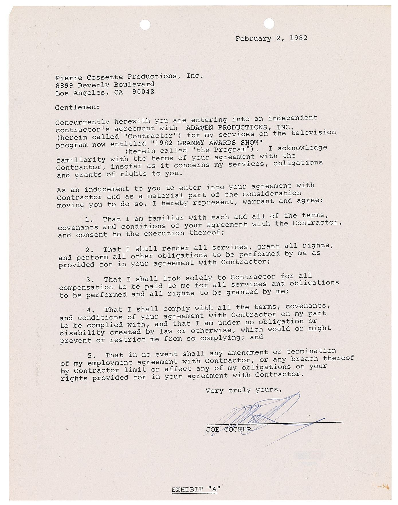 DS, one page, 8.5 x 11, no date. An Exhibit 'A' document issued by Joe Cocker to Pierre Cossette Productions, Inc., regarding an agreement between the latter and Adaven Productions, Inc., for Cocker's "services on the television program now entitled '1982 Grammy Awards Show.'" Signed at the conclusion in blue ballpoint by Cocker. In fine condition, with a tape-repaired tear to lower right. Accompanied by a certificate of authenticity from PSA/DNA.