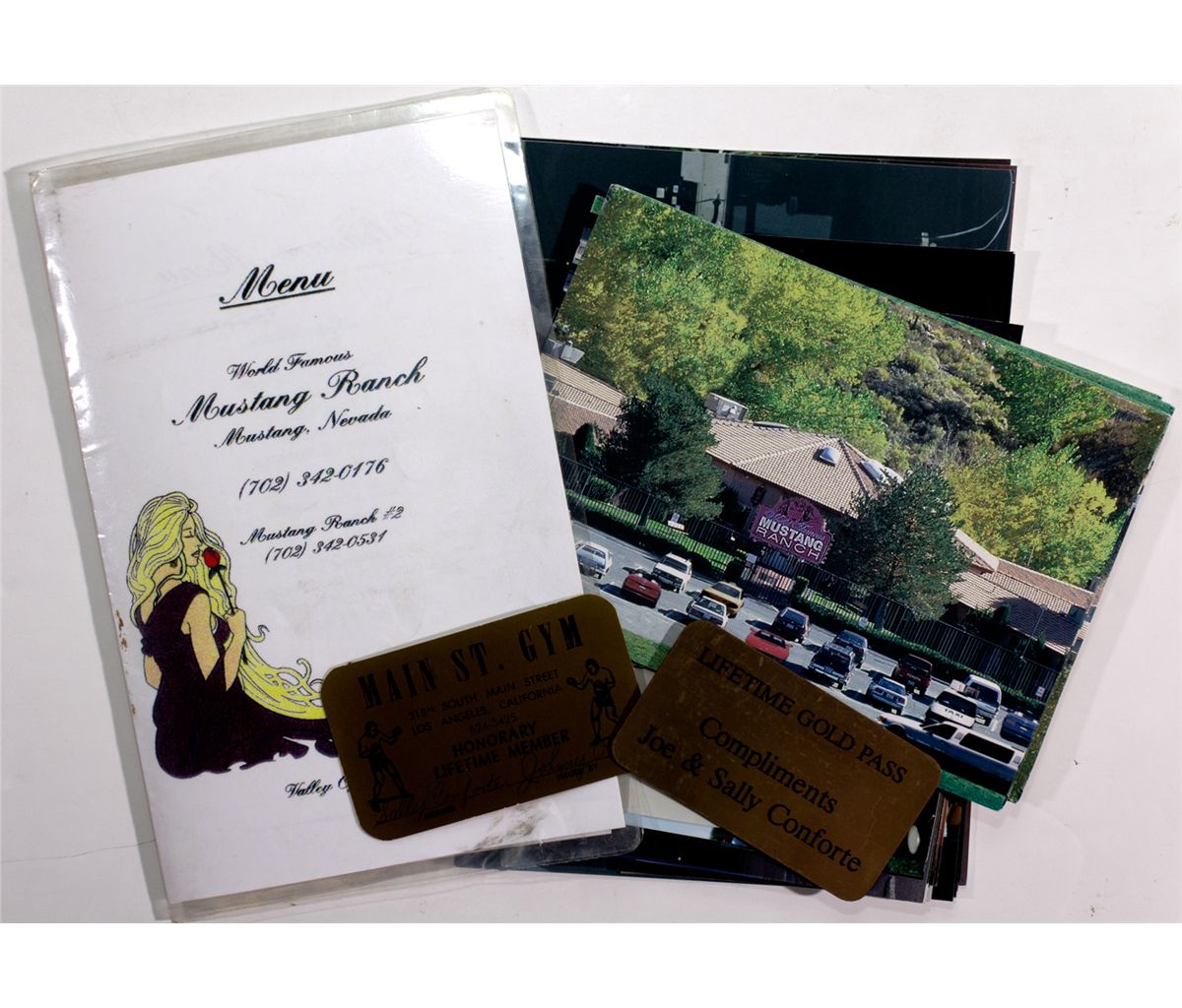 Mustang Ranch archive including photos of Joe and Sally Conforte, prostitutes, and one photo of Oscar Bonavena and Sally. Also includes photos of Conforte at casino shows, Sally Conforte's gold credit card, a Mustang Ranch "gold card" lifetime pass, Sally's lifetime membership card to the Main St. Gym in Los Angeles, and Joe's life member card in the American Bridge Society #22856 from 1975. Personal letters to Conforte from "Rita" in Panama, including a Father's Day card. -59944