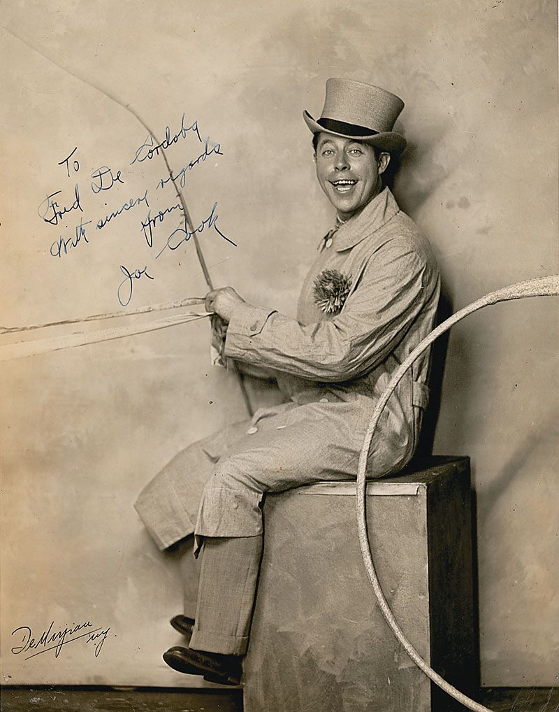 Humorous vintage oversized pearl-finish 10.25 x 13.25 portrait of Cook in costume for Fine and Dandy, signed and inscribed in fountain pen, “To Fred De Cordoba, with sincere regards, from Joe Cook.” In fine condition, with some scattered surface creases and a slight brush to inscription.