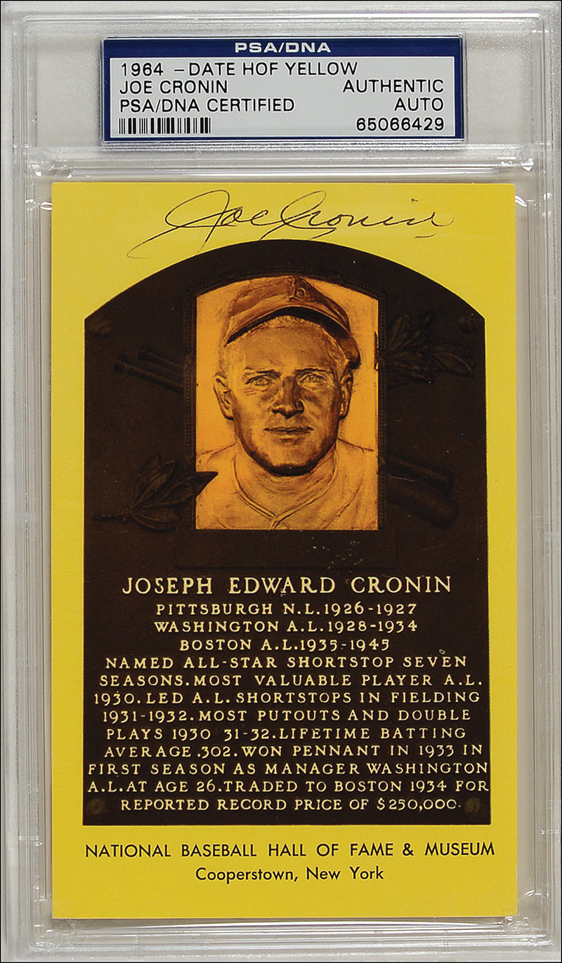 Gold Hall of Fame plaque card signed across the top in black ballpoint. Encapsulated in a plastic PSA/DNA authentication holder. In fine condition.