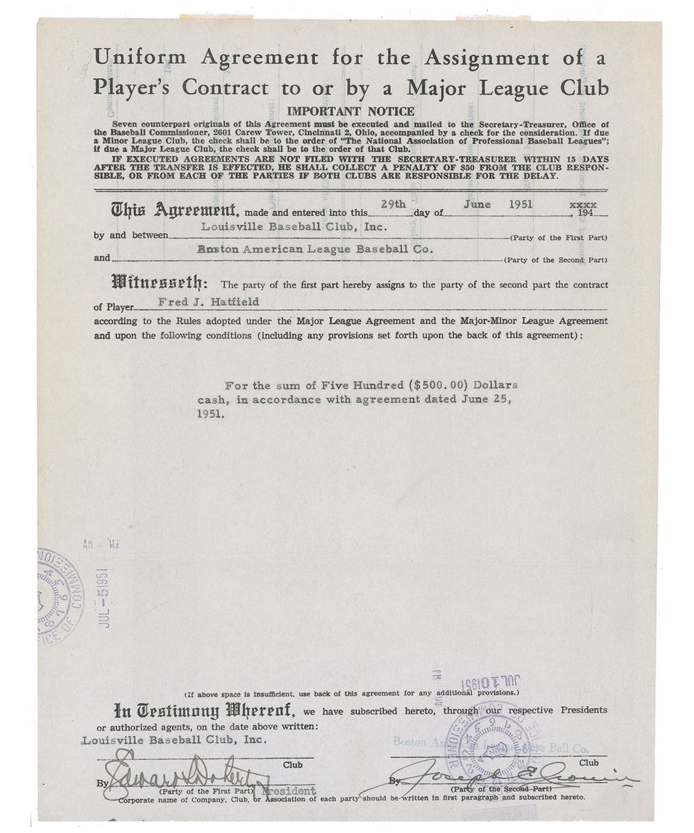 DS, signed “Joseph E. Cronin,” one page of onionskin paper, 8.5 x 11, June 29, 1951. In a Uniform Agreement for the Assignment of a Player’s Contract to or by a Major League Club, Cronin signs Fred Hatfield to the Boston American League Baseall Co. for $500. In very good condition, with light creasing and toning, staple marks to the top left corner, two adhesive strips at the top edge from previous display, and two officiating stamps, one of which lightly affects the signature.