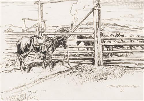 Joe De Yong (1894-1975). At the Gate. 8 1/2" x 12 1/2" pencil and pen and ink drawing. Signed lower right. (est $1,500-2,000)