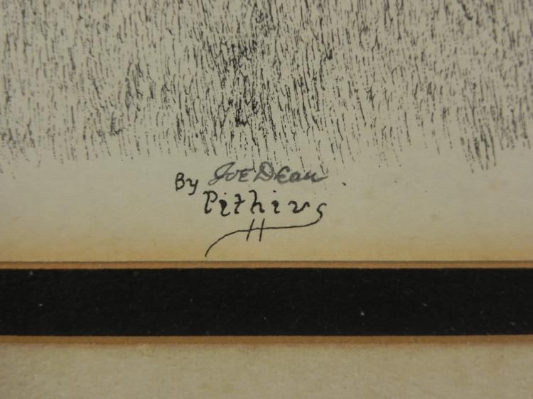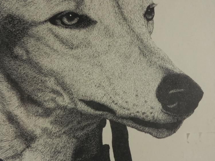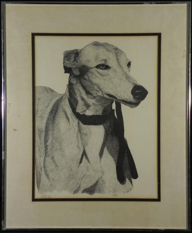 This drawing is a wonderfully detailed portrait of a handsome greyhound. * * Artist: Joe Dean Pithius * Title: Paradise Hass / A Greyhound Posing * Signature: in pencil, lower right * Medium: Drawing on paper * Number: 23-198 * Image size: 16 x 21 inches * Framing: Double matted in black and white, in silver chrome metal frame * Frame size: 22 1/4 x 29 1/2 inches * Condition: Excellent; frame has tape residue, can be cleaned