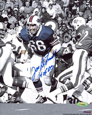 Joe DeLamielleure is a former American football offensive lineman who was an All-American at Michigan State. He was selected by the Buffalo Bills in the first round of the 1973 NFL Draft. He won All-Rookie Honors, after finding out a physical condition with his irregular heartbeat was not serious. In 1973 the Buffalo Bills rushing offense led the NFL in yards, yards per carry, as well as rushing touchdowns. DeLamielleure was perhaps the central figure in the "Electric Company," the Bills' offensive line that paved the way for O.J. Simpson to rush for 2,003 yards in 1973, the first player ever to break that barrier, and the only player ever to do so in a 14-game schedule. Joe DeLamielleure has hand signed this Buffalo Bills 8x10 Spotlight Photo with HOF 03 inscription. Tri-Star Hologram and Certificate of Authenticity from Athlon Sports.