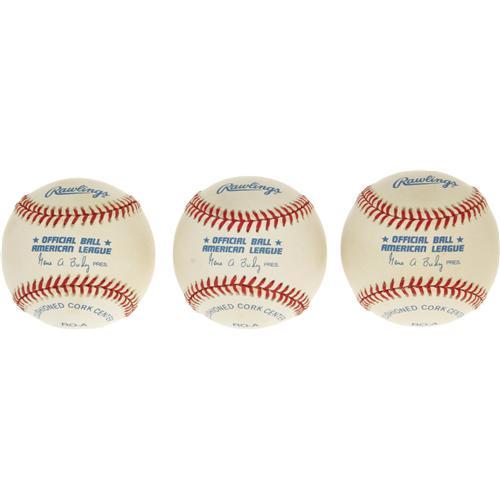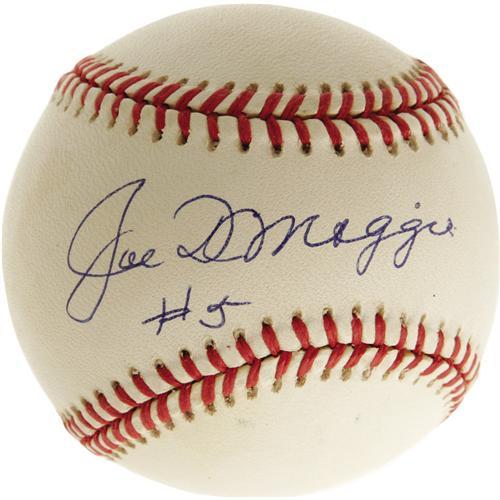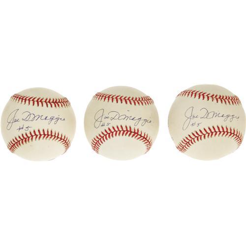 <B>Joe DiMaggio "#5" Single Signed Baseballs Lot of 3.</B></I> The greatest name in New York City baseball during the years surrounding the Second World War makes note of his retired jersey number along with perfect sweet spot signatures on three OAL (Budig) baseballs. Each ball shows light, inconsequential toning that does not interfere with the autographs. A notarized letter of authenticity from DiMaggio's lawyer Morris Engelberg is included for each baseball, allowing the balls to easily be sold separately if so desired.<I>LOA from PSA/DNA.</B></I>