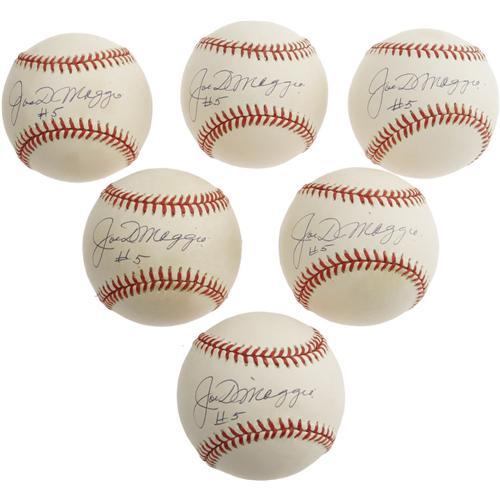 <B>Joe DiMaggio #5 Single Signed Baseballs Lot of 6.</B></I> Knowledgeable autograph collectors understand that Joltin' Joe was not a big fan of adding notations to his signature when he signed, so this half-dozen OAL (Budig) balls carries a definite premium in the market. Each 10/10 blue ink sweet spot signature is tagged with DiMaggio's immortal number "5." And each is accompanied by its own letter of authenticity from Joe's friend and attorney Morris Engelberg. Baseballs show very mild toning but still present beautifully. <I>LOA from PSA/DNA.</B></I> <BR><BR><B>Important notice:</B> Heritage usually auctions material at the rate of 200-250 lots per hour. On some occasions eBay Live bid software or the Internet may not be able to keep up with the pace of the auction. We recommend placing a realistic absentee bid now as insurance to avoid disappointment. Occasionally the auctioneer may eliminate or reject an eBay Live bid, and the auctioneer may also reopen a lot after the close of the eBay live bidding (usually because we missed an audience bid), and may reject your bid even if it shows you as the winning bidder. By bidding via eBay Live, you agree that Heritage may award the lot to another bidder at its sole discretion under the circumstances described above or any other reasonable circumstances. Since eBay bids are not shown to us until we open the lot on the floor, we treat those bids just like floor bids. In most cases the floor responds before the eBay bid is presented to us, due to Internet lag time, so for consistency we have made it a policy that floor bids are always considered first over tie eBay live bids. Also please note that all Heritage lots purchased through eBay Live carry a 22.5% Buyer's Premium. Please make sure you read the Terms and Conditions before you bid. This lot is being auctioned in conjunction with a live floor auction by Heritage Galleries & Auctioneers. All final auction and invoice information will be supplied by Heritage Galleries & Auctioneers, and all other information should be considered preliminary. Lot:19035 <BR><BR><B>Winning Notification and Billing:</B> After the FINAL session in this auction is complete, Heritage will send e-mail and snail mail invoices. This process normally takes several days. All final auction and invoice information will be supplied by Heritage Galleries & Auctioneers, and all other information should be considered preliminary. <BR><BR>This auction will be conducted on a live auction floor and over the Internet through eBay Live. If you choose to place an absentee bid, please take a moment to <font color='#0000ff'><u><a href='http://pages.ebay.com/liveauctions/help/before/laabsentee.html'>learn how eBay Live absentee bidding works</a></u></font><font color='#000000'>