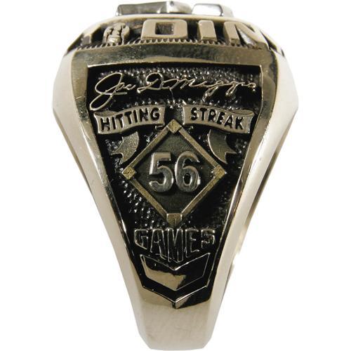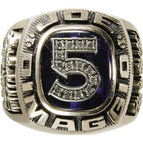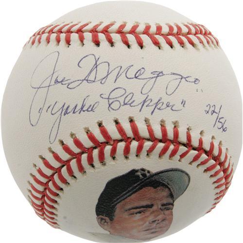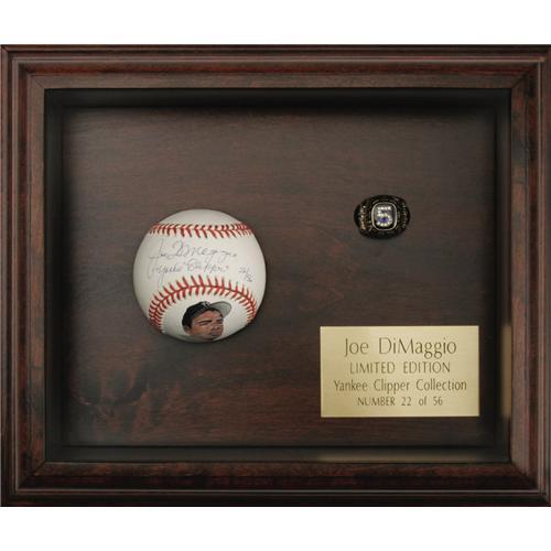 <B>Joe DiMaggio Career Ring & Signed Baseball Display.</B></I> For the collector looking for an elegant piece for the desk of his office, or to place beside his humidor in his smoking room, we present this dignified display honoring the great Joltin' Joe DiMaggio. A wood and glass case (10x12x4") houses a ten karat gold ring and a single signed portrait baseball. The former features a diamond-studded number "5" on a blue stone with "Joe DiMaggio" running the perimeter in raised lettering. The left shank celebrates DiMaggio's fifty-six game hitting streak, while the right notes his career statistics. Inside of band is engraved "YC 22/56," making note of the limited edition. Ring is size ???. The baseball is numbered with the same "22/56," with a 10/10 sweet spot signature adding the highly desirable "Yankee Clipper" notation. A magnificent portrait of DiMaggio appears on the panel below of the "Official League" ball. Both the baseball and the included LOA are affixed with Yankee Clipper Enterprises authenticating sticker from Joe's lawyer Morris Engelberg. <I>LOA from PSA/DNA.</B></I> <BR><BR><B>Important notice:</B> Heritage usually auctions material at the rate of 200-250 lots per hour. On some occasions eBay Live bid software or the Internet may not be able to keep up with the pace of the auction. We recommend placing a realistic absentee bid now as insurance to avoid disappointment. Occasionally the auctioneer may eliminate or reject an eBay Live bid, and the auctioneer may also reopen a lot after the close of the eBay live bidding (usually because we missed an audience bid), and may reject your bid even if it shows you as the winning bidder. By bidding via eBay Live, you agree that Heritage may award the lot to another bidder at its sole discretion under the circumstances described above or any other reasonable circumstances. Since eBay bids are not shown to us until we open the lot on the floor, we treat those bids just like floor bids. In most cases the floor responds before the eBay bid is presented to us, due to Internet lag time, so for consistency we have made it a policy that floor bids are always considered first over tie eBay live bids. Also please note that all Heritage lots purchased through eBay Live carry a 22.5% Buyer's Premium. Please make sure you read the Terms and Conditions before you bid. This lot is being auctioned in conjunction with a live floor auction by Heritage Galleries & Auctioneers. All final auction and invoice information will be supplied by Heritage Galleries & Auctioneers, and all other information should be considered preliminary. Lot:19536 <BR><BR><B>Winning Notification and Billing:</B> After the FINAL session in this auction is complete, Heritage will send e-mail and snail mail invoices. This process normally takes several days. All final auction and invoice information will be supplied by Heritage Galleries & Auctioneers, and all other information should be considered preliminary. <BR><BR>This auction will be conducted on a live auction floor and over the Internet through eBay Live. If you choose to place an absentee bid, please take a moment to <font color='#0000ff'><u><a href='http://pages.ebay.com/liveauctions/help/before/laabsentee.html'>learn how eBay Live absentee bidding works</a></u></font><font color='#000000'>