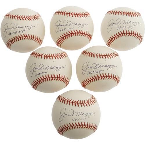 <B>Joe DiMaggio HOF 55 Single Signed Baseballs Lot of 6.</B></I> Though 1955 was a disappointing year for his former Yankee squad, who finally fell to the perennial rival Brooklyn Dodgers in October, it was a fine year for the Yankee Clipper, who was enshrined at Cooperstown a few months earlier. Here he notes that happy occasion with a rare notation that joins his 10/10 sweet spot signatures. Each is accompanied by its own letter of authenticity from Joe's friend and attorney Morris Engelberg. Baseballs show very mild toning but still present beautifully. <I>LOA from PSA/DNA.</B></I> <BR><BR><B>Important notice:</B> Heritage usually auctions material at the rate of 200-250 lots per hour. On some occasions eBay Live bid software or the Internet may not be able to keep up with the pace of the auction. We recommend placing a realistic absentee bid now as insurance to avoid disappointment. Occasionally the auctioneer may eliminate or reject an eBay Live bid, and the auctioneer may also reopen a lot after the close of the eBay live bidding (usually because we missed an audience bid), and may reject your bid even if it shows you as the winning bidder. By bidding via eBay Live, you agree that Heritage may award the lot to another bidder at its sole discretion under the circumstances described above or any other reasonable circumstances. Since eBay bids are not shown to us until we open the lot on the floor, we treat those bids just like floor bids. In most cases the floor responds before the eBay bid is presented to us, due to Internet lag time, so for consistency we have made it a policy that floor bids are always considered first over tie eBay live bids. Also please note that all Heritage lots purchased through eBay Live carry a 22.5% Buyer's Premium. Please make sure you read the Terms and Conditions before you bid. This lot is being auctioned in conjunction with a live floor auction by Heritage Galleries & Auctioneers. All final auction and invoice information will be supplied by Heritage Galleries & Auctioneers, and all other information should be considered preliminary. Lot:19036 <BR><BR><B>Winning Notification and Billing:</B> After the FINAL session in this auction is complete, Heritage will send e-mail and snail mail invoices. This process normally takes several days. All final auction and invoice information will be supplied by Heritage Galleries & Auctioneers, and all other information should be considered preliminary. <BR><BR>This auction will be conducted on a live auction floor and over the Internet through eBay Live. If you choose to place an absentee bid, please take a moment to <font color='#0000ff'><u><a href='http://pages.ebay.com/liveauctions/help/before/laabsentee.html'>learn how eBay Live absentee bidding works</a></u></font><font color='#000000'>
