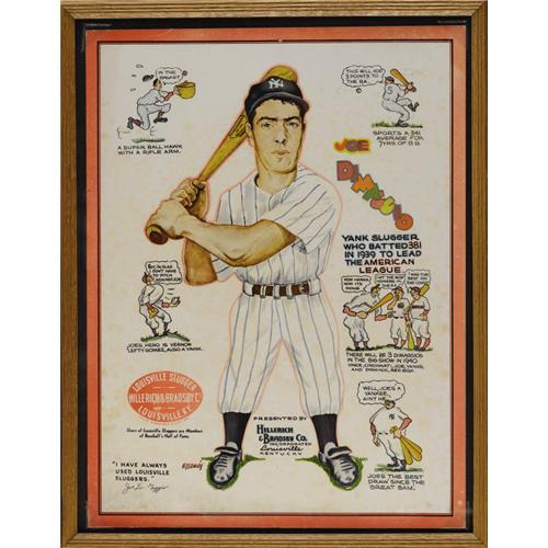 <B>1940 Joe DiMaggio Hillerich & Bradsby Advertising Sign.</B></I> Those who participated in our October 2005 Signature auction will likely remember our presentation of a signed example of this very rare advertising piece, a relic from the famed collection of Barry Halper. And while the fine inscription from DiMaggio was considered a positive addition by many, there are certainly others who prefer their advertising pieces unadulterated, and so we're very happy to offer this scarce counter sign for the purists among our bidding clientele. Don't let the fact that this is the second we've found trick you into believing these signs grow on trees--nothing could be further from the truth. While H&B put out a collection of similar signs in the mid-1940's, this DiMaggio issue is infinitely more scarce, and the visual appeal is undeniable. The condition is terrific for a piece of this vintage, with a small nail hole in the center border and very light toning that does almost nothing to detract from visual appeal. There are no creases, tears or significant stains as is typical of almost all signs predating the United States' involvement in the Second World War. The cultured advertising sign collector will surely not be disappointed. Sign measures 15.5x20.5", and is framed simply and tastefully to slightly larger dimensions. <BR><BR><B>Important notice:</B> Heritage usually auctions material at the rate of 200-250 lots per hour. On some occasions eBay Live bid software or the Internet may not be able to keep up with the pace of the auction. We recommend placing a realistic absentee bid now as insurance to avoid disappointment. Occasionally the auctioneer may eliminate or reject an eBay Live bid, and the auctioneer may also reopen a lot after the close of the eBay live bidding (usually because we missed an audience bid), and may reject your bid even if it shows you as the winning bidder. By bidding via eBay Live, you agree that Heritage may award the lot to another bidder at its sole discretion under the circumstances described above or any other reasonable circumstances. Since eBay bids are not shown to us until we open the lot on the floor, we treat those bids just like floor bids. In most cases the floor responds before the eBay bid is presented to us, due to Internet lag time, so for consistency we have made it a policy that floor bids are always considered first over tie eBay live bids. Also please note that all Heritage lots purchased through eBay Live carry a 22.5% Buyer's Premium. Please make sure you read the Terms and Conditions before you bid. This lot is being auctioned in conjunction with a live floor auction by Heritage Galleries & Auctioneers. All final auction and invoice information will be supplied by Heritage Galleries & Auctioneers, and all other information should be considered preliminary. Lot:19523 <BR><BR><B>Winning Notification and Billing:</B> After the FINAL session in this auction is complete, Heritage will send e-mail and snail mail invoices. This process normally takes several days. All final auction and invoice information will be supplied by Heritage Galleries & Auctioneers, and all other information should be considered preliminary. <BR><BR>This auction will be conducted on a live auction floor and over the Internet through eBay Live. If you choose to place an absentee bid, please take a moment to <font color='#0000ff'><u><a href='http://pages.ebay.com/liveauctions/help/before/laabsentee.html'>learn how eBay Live absentee bidding works</a></u></font><font color='#000000'>