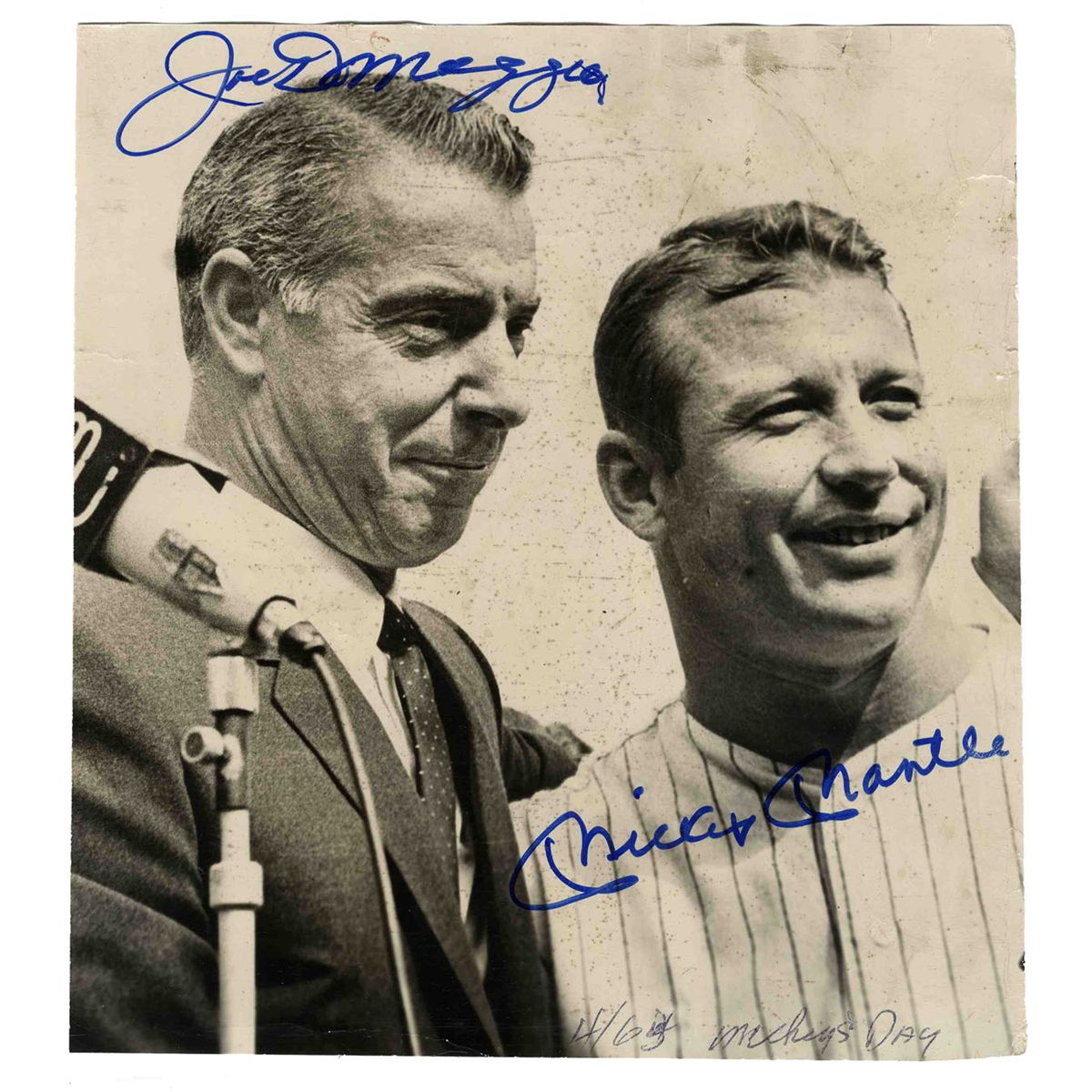 Joe DiMaggio & Mickey Mantle signed photo, commemorating the announcement of Mantle's retirement. Signed by both legends in blue marker. Trimmed image measures 7.5'' x 8''. Accompanied by Certificate of Authenticity from PSA/DNA. Overall in very good condition.