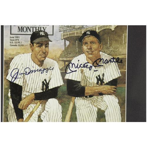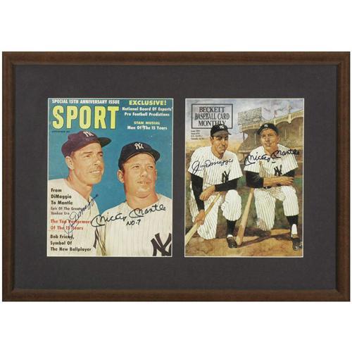 <B>Joe DiMaggio & Mickey Mantle Signed Magazine Covers Display from the Sarabella Collection.</B></I> You can never have too much of a good thing, and that sentiment is never more valid than when discussing DiMaggio and Mantle dual-signed magazine covers. This simple display features a pair of covers signed in perfect blue sharpie by the men who patrolled Yankee Stadium's center field for three decades, earning Hall of Fame immortality in the process. A 1960's issue of "Sport Magazine" has Mickey adding his coveted "No. 7" inscription to his autograph, while the June 1991 cover of "Beckett Baseball Card Monthly" offers an unadulterated signature from each. The earlier magazine cover has light, inconsequential surface wear, while the later one presents as Mint. Matted and framed to 17x23". <I>LOA from PSA/DNA. LOA from James Spence Authentication.</B></I><BR><BR><b>Shipping:</b> Framed (<a target="_blank" href="http://www.heritageauctions.com/common/shipping.php">view shipping information</a>)