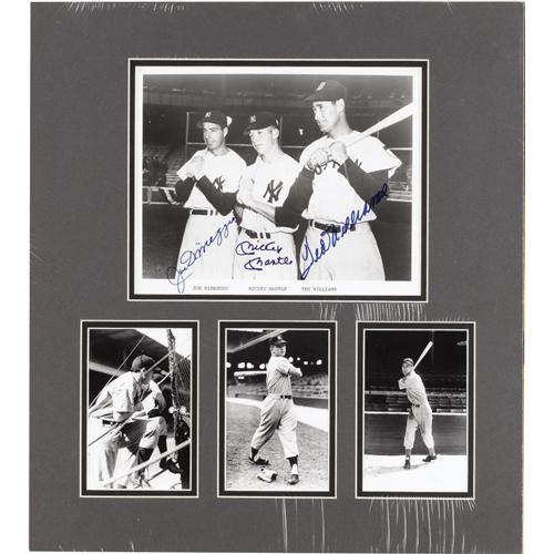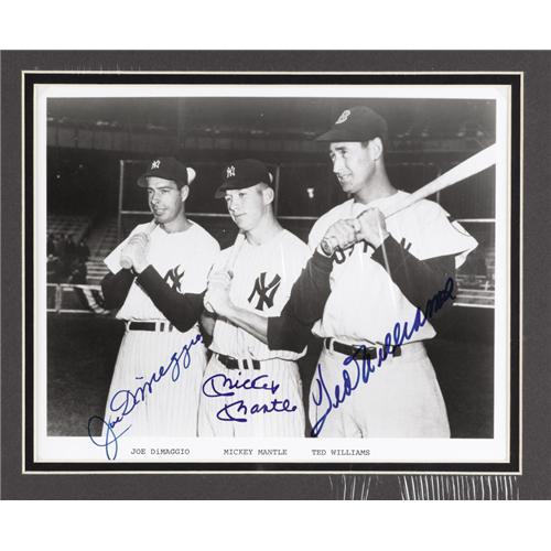 <B>Joe DiMaggio, Mickey Mantle & Ted Williams Signed Photograph.</B></I> Terrific 8x10" black and white print of this famous 1951 photograph bears a 10/10 blue sharpie signature from each Hall of Fame icon pictured. The shot is attractively matted above postcard-sized snapshots of each superstar slugger in his respective rookie season. Total dimensions are 17x19". While each autograph is individually fairly simple to find, the opportunities to purchase a piece signed by all three becomes more and more scarce, so smart bidders will keep this fact in mind. <I>LOA from PSA/DNA. LOA from James Spence Authentication.</B></I><BR><BR><b>Shipping:</b> Large Flat (<a target="_blank" href="http://www.heritageauctions.com/common/shipping.php">view shipping information</a>)