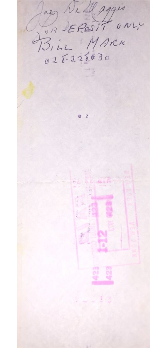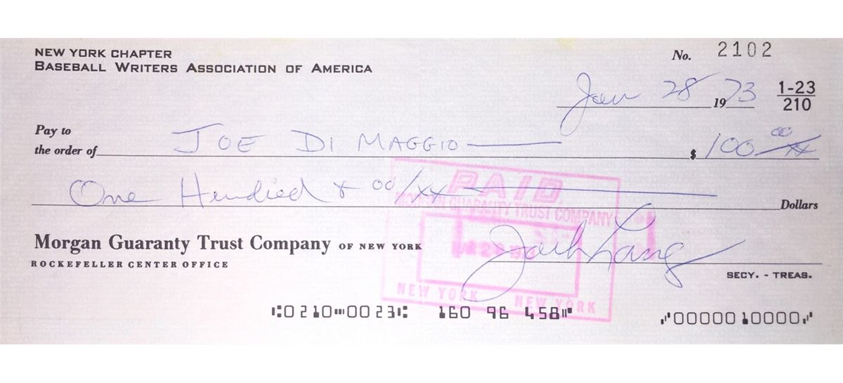 Joe DiMaggio Original Signed Bank Check from the NY Baseball Writers Association in 1973