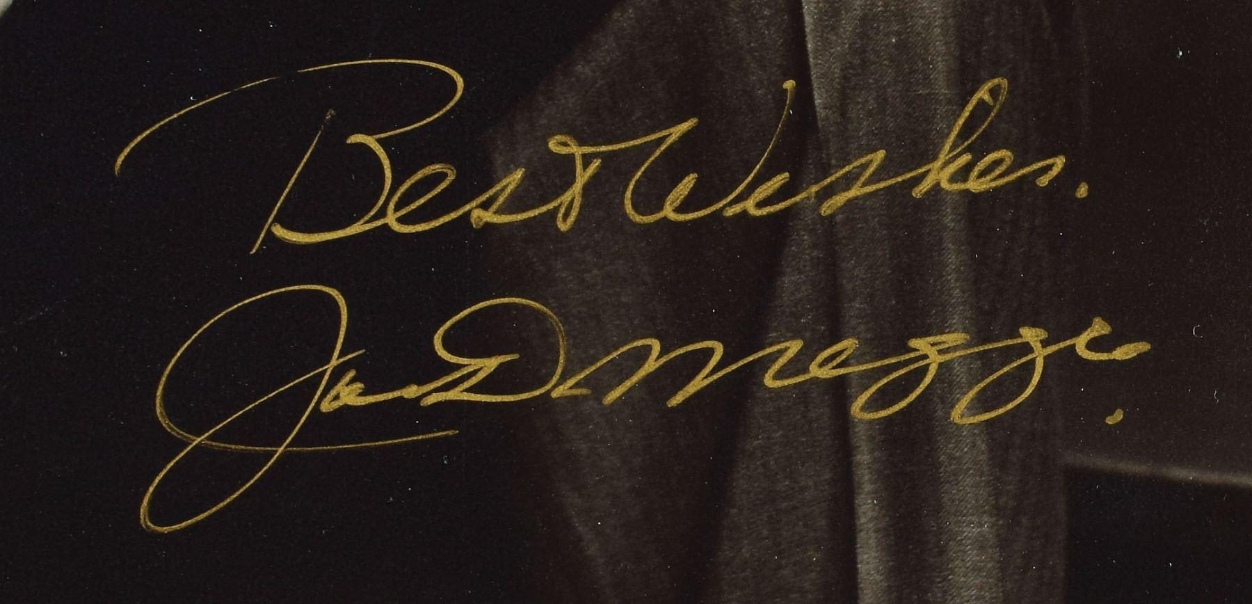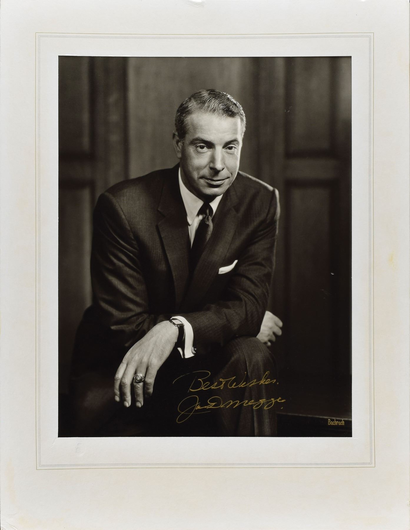 Glamorous oversized matte-finish 10.25 x 13.25 photograph of DiMaggio in the early 1960s by renowned portrait photographer Louis Fabian Bachrach, Jr., neatly signed in gold ink, "Best wishes, Joe DiMaggio." Matted to an overall size of 14.25 x 18.5. In excellent overall condition, with a couple small surface creases to the photo.