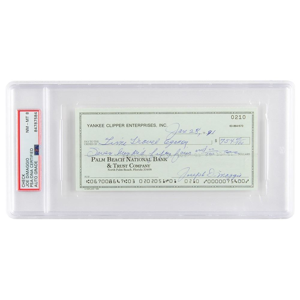 Yankee Clipper Enterprises, Inc. business check, 6 x 2.75, filled out and signed by DiMaggio, "Joseph DiMaggio," payable to "Time Travel Agency" for $754, January 28, 1991. In very fine condition. Encapsulated and graded by PSA/DNA as "NM-MT 8."
