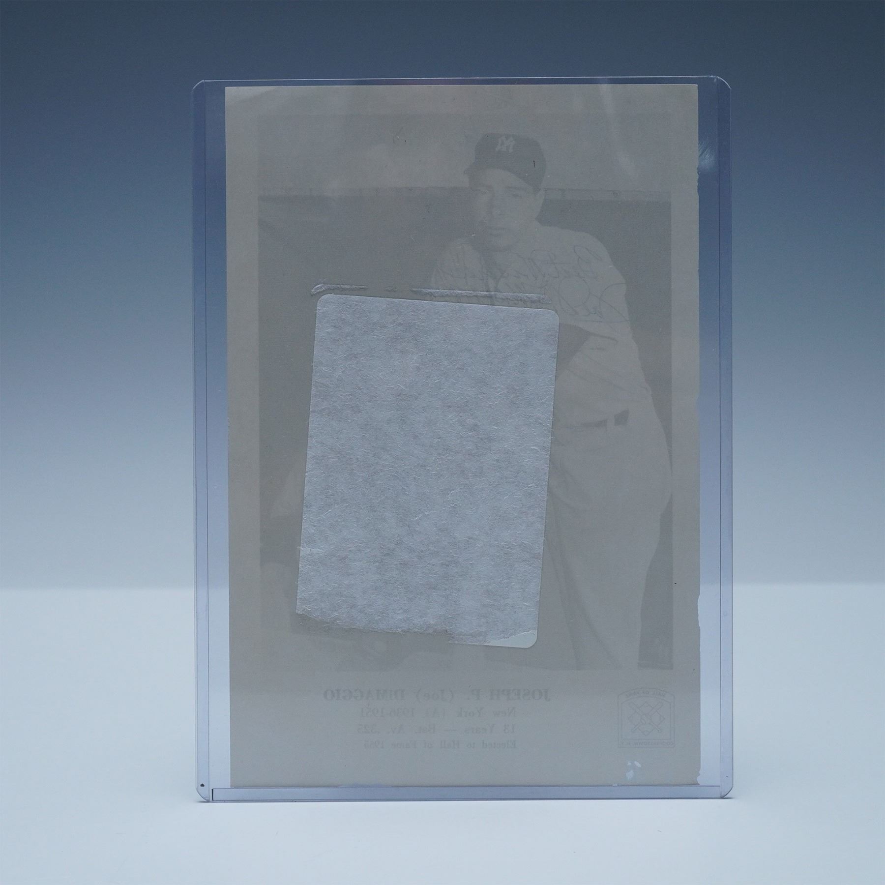 This vintage Hall of Fame tribute print features an iconic black-and-white image of legendary New York Yankees center fielder Joe DiMaggio (1914-1999), signed in blue ink with an inscription reading "Best Wishes." DiMaggio, a revered figure in baseball history, played 13 seasons with the Yankees (1936-1951), boasting a .325 career batting average and earning induction into the Baseball Hall of Fame in 1955. The print highlights his accomplishments and legacy, including his unmatched 56-game hitting streak. Encapsulated in a protective holder, this signed memorabilia is a remarkable collector's piece celebrating the Yankee Clipper's storied career.