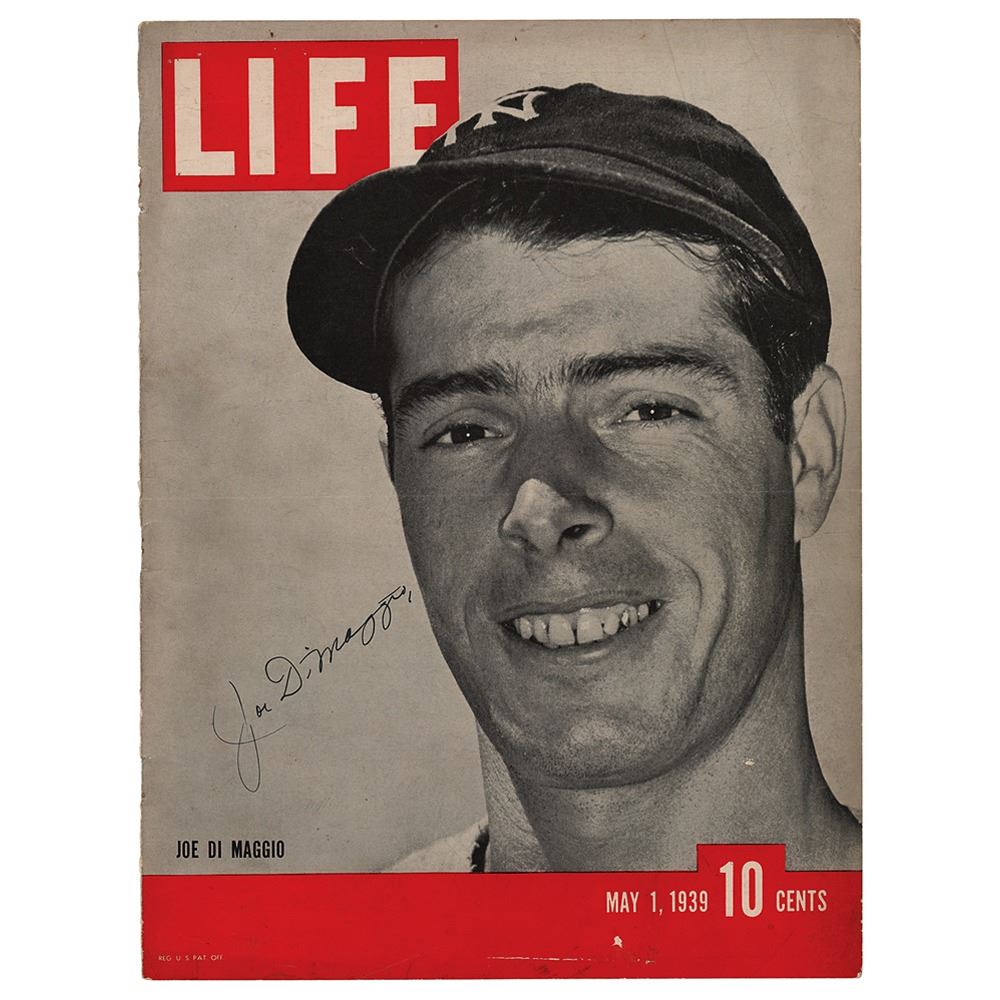 Front cover of Life Magazine from May 1, 1939, 10.5 x 14, featuring a close-up image of New York Yankees star Joe DiMaggio, signed black felt tip. In very good to fine condition, with some creasing, and a central horizontal mailing fold.