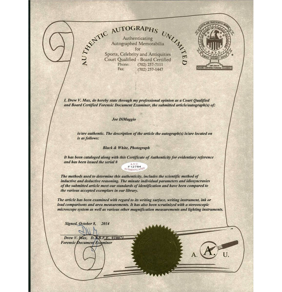 Joe DiMaggio Signed Photograph Certified by AAU, this photograph measures 8 x 10 inches.