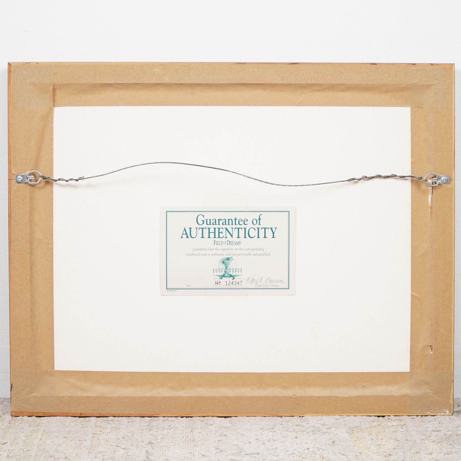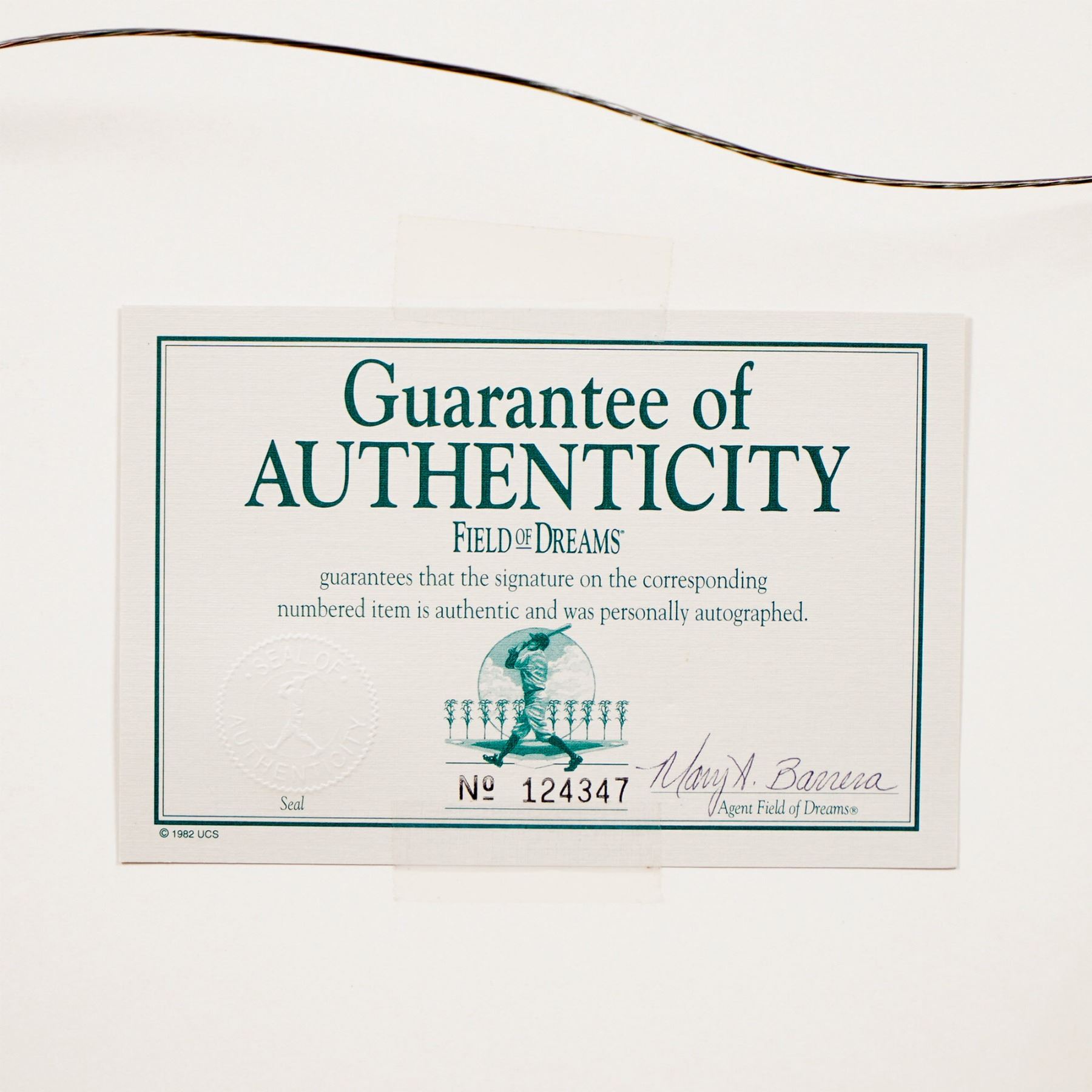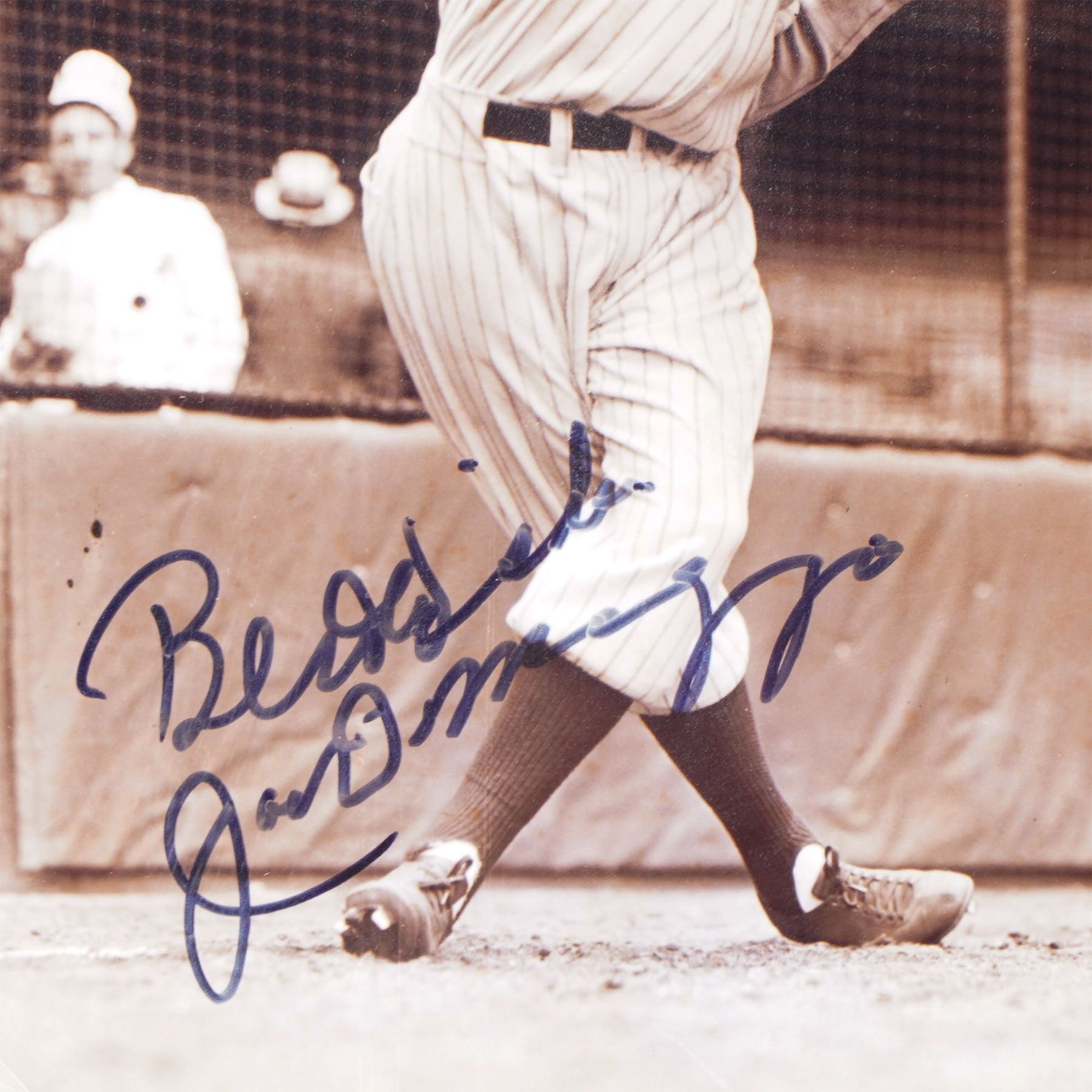 This framed Joe DiMaggio autographed photograph is a tribute to the legendary New York Yankees Hall of Famer. The sepia-toned image captures DiMaggio in action at the plate, with a bold signature inscribed "Best Wishes, Joe DiMaggio" in blue ink. Accompanied by a commemorative plaque detailing his career highlights, including 13 American League pennants, 9 World Series Championships, and his iconic 56-game hitting streak, this piece is professionally framed with a black border. It includes a Field of Dreams Certificate of Authenticity (COA) #124347 affixed to the back, ensuring the legitimacy of the signature. A must-have for baseball collectors and Yankees fans alike.