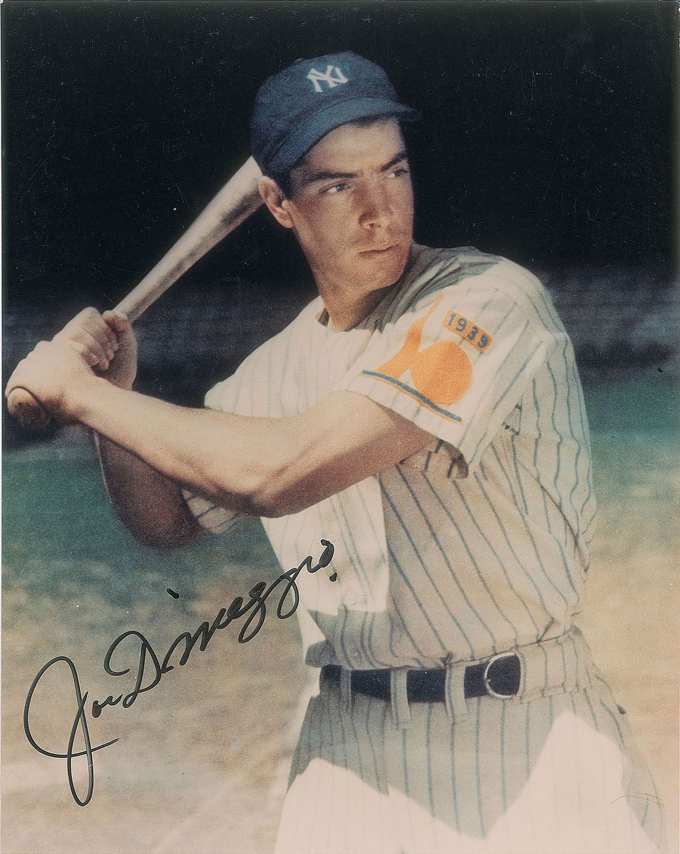 Color satin-finish 8 x 10 photo of DiMaggio in 1939, signed in black felt tip. A typed collector's annotation on the reverse indicates that it was signed on April 8, 1989. In fine condition.