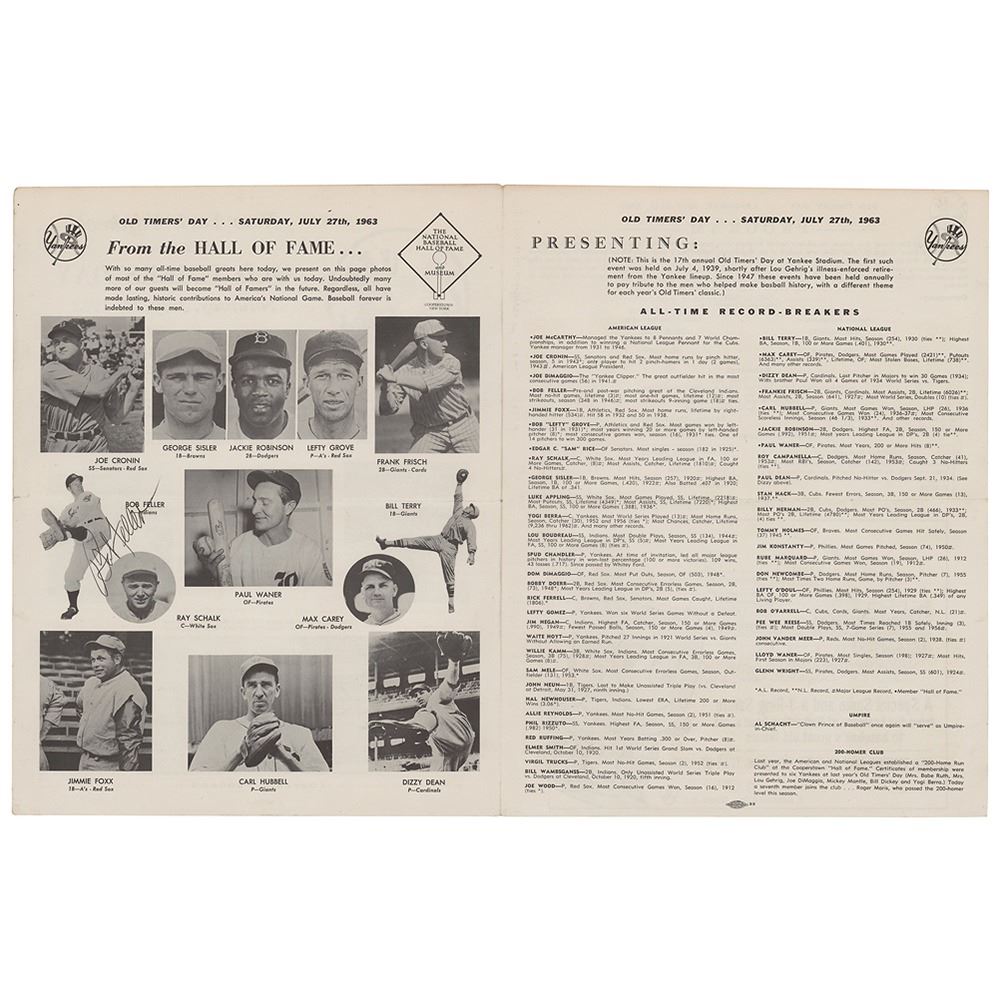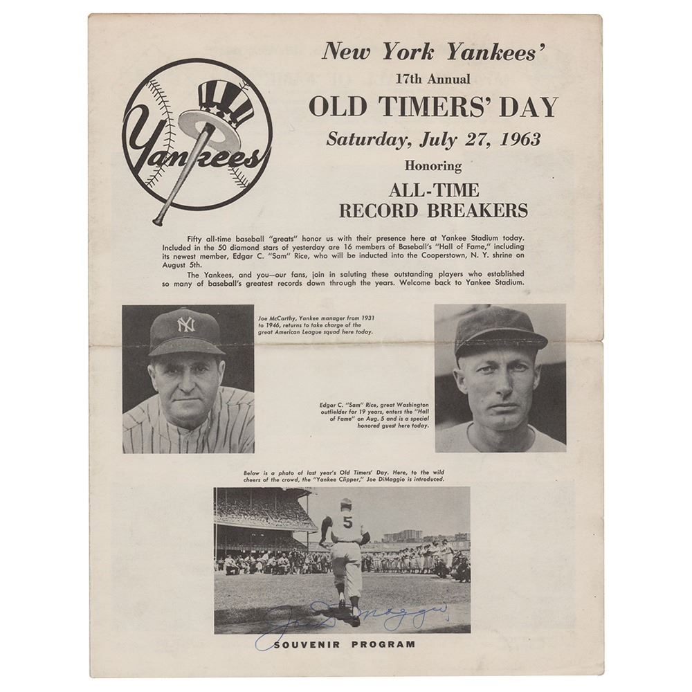 Program for the New York Yankees' 17th Annual Old Timers' Day on July 27, 1963, two pages, 8.5 x 11, signed on the front in blue ballpoint by Joe DiMaggio, and signed inside in black ballpoint by Bob Feller. In fine condition, with a central horizontal fold.