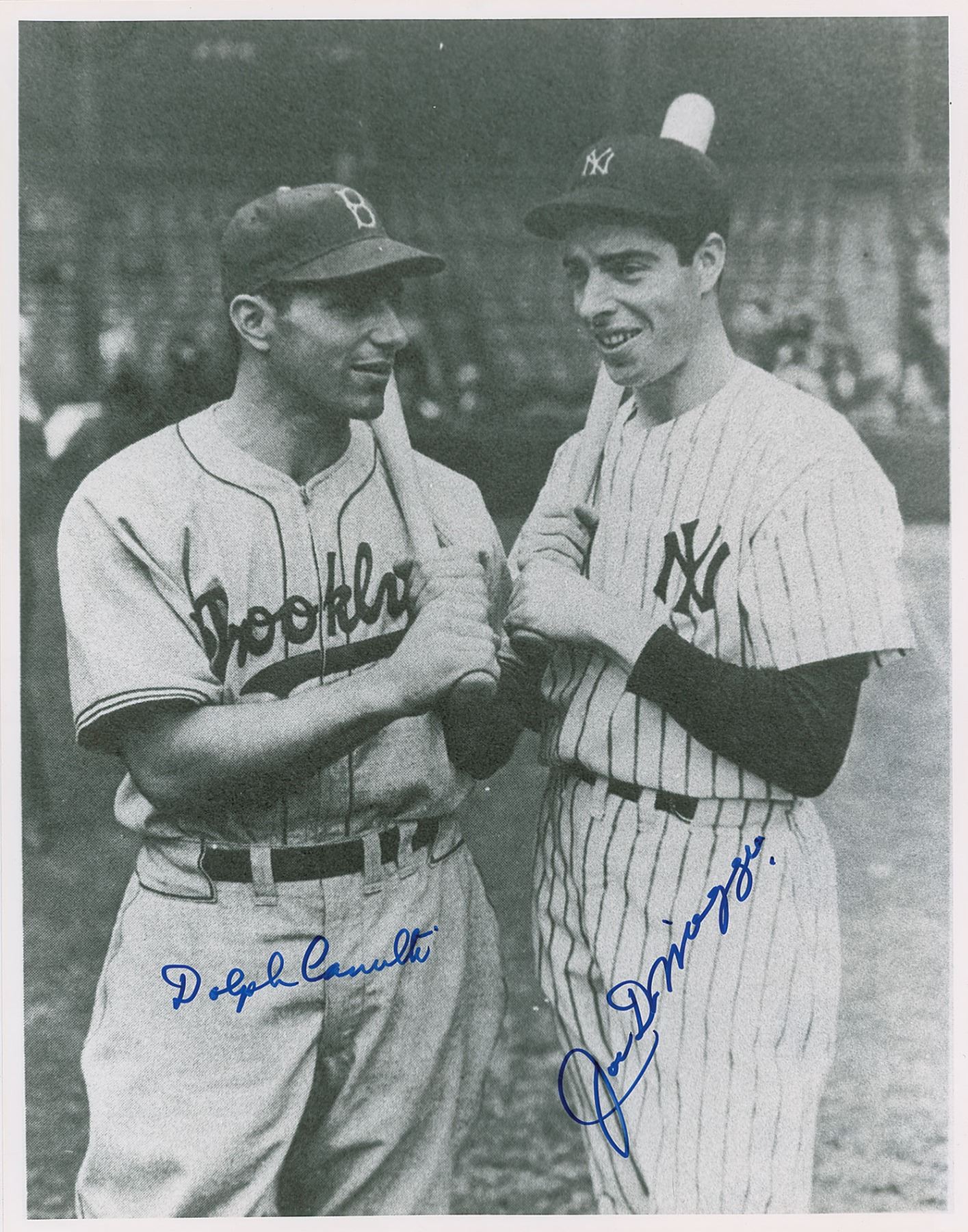 Glossy 11 x 14 photo of the crosstown rivals in their New York Yankees and Brooklyn Dodgers uniforms, signed in blue felt tip by Joe DiMaggio and Dolph Camilli. In fine condition, with some small surface creases, and rather grainy image quality. Accompanied by a full letter of authenticity from JSA.