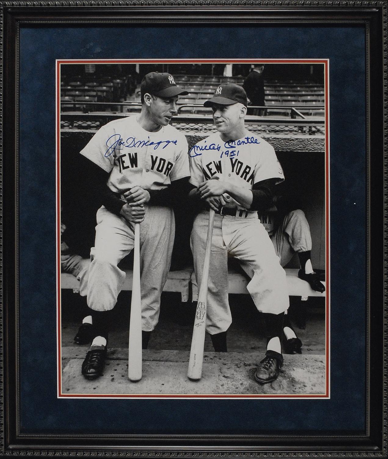 Glossy 16 x 20 photo of Joe DiMaggio and Mickey Mantle posing in their Yankees road uniforms during their 1951 season, signed in blue felt tip, “Joe DiMaggio,” and “Mickey Mantle 1951.” Double suede matted and framed to an overall size of 22 x 26. In very fine condition. Mantle and DiMaggio were teammates for just one season, with Mantle replacing DiMaggio in center field at the beginning of the 1952 season. An impressive oversized portrait of two baseball legends.