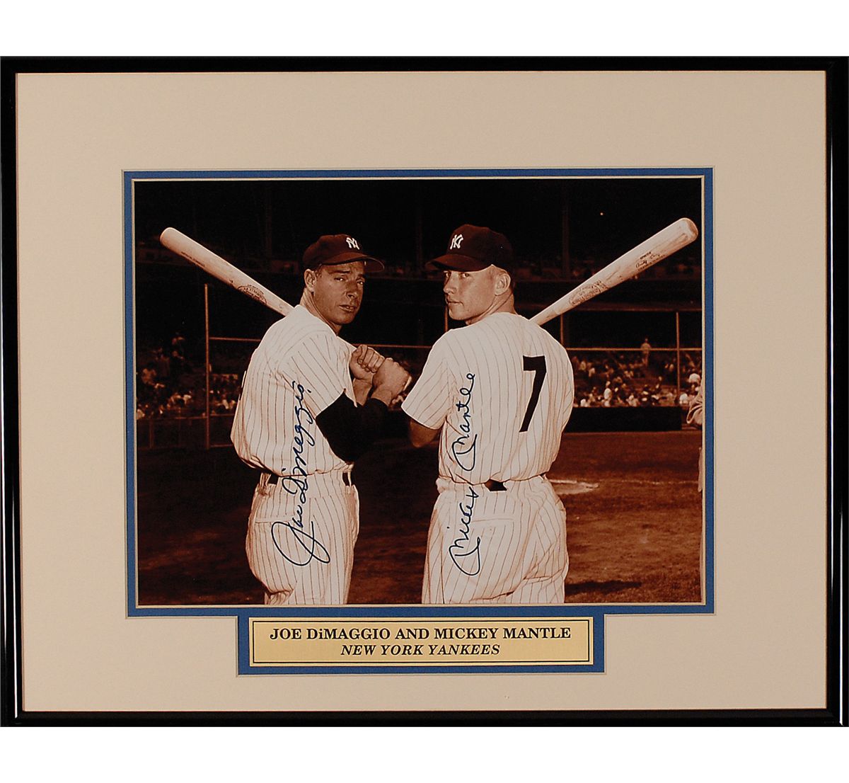 Glossy 14 x 11 photo of DiMaggio and Mantle posing together with their bats on their shoulders prior to a game at Yankee Stadium, signed in blue felt tip by both Joe DiMaggio and Mickey Mantle. Double matted and framed with a small plaque, to an overall size of 20.25 x 16.5. Accompanied by a certificate of authenticity from Score Board. In very fine condition.
