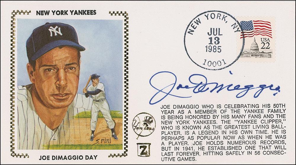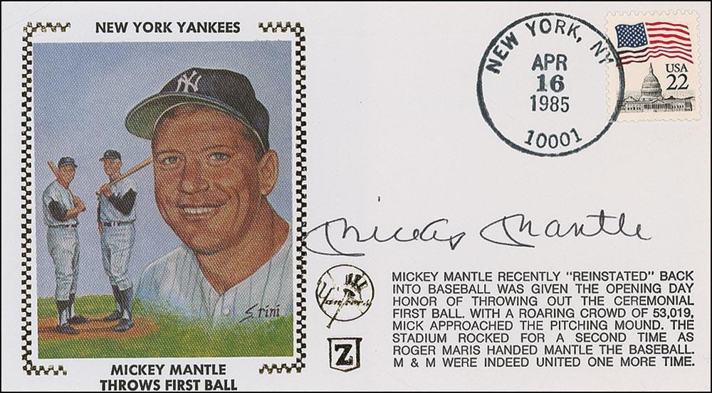 Two commemorative covers, bearing color silk cachets of Mantle and DiMaggio respectively, one signed in blue ink by DiMaggio and the other signed in black ink by Mantle. In very fine condition. Pre-certified Steve Grad/PSA/DNA and RRAuction COA.