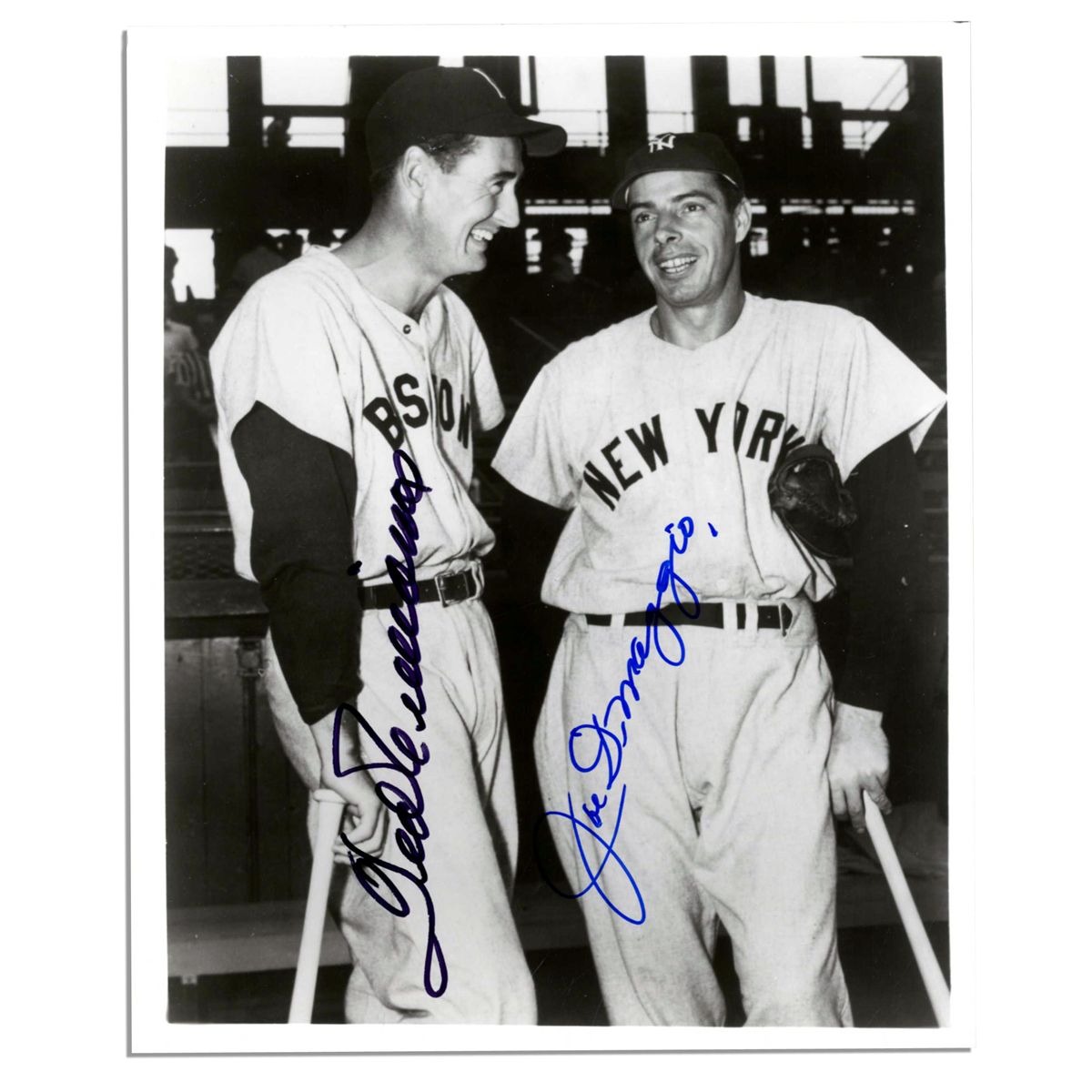 Baseball Hall of Famers Joe DiMaggio and Ted Williams 8'' x 10'' signed photo. DiMaggio signs ''Joe DiMaggio'' in blue pen and Williams writes ''Ted Williams'' in black. DiMaggio and Williams both still hold records in Major League Baseball, DiMaggio for his 56 game hitting streak, and Williams with the highest career batting average of anyone with 500 or more home runs. Glossy photo is in fine condition. With PSA/DNA COA.