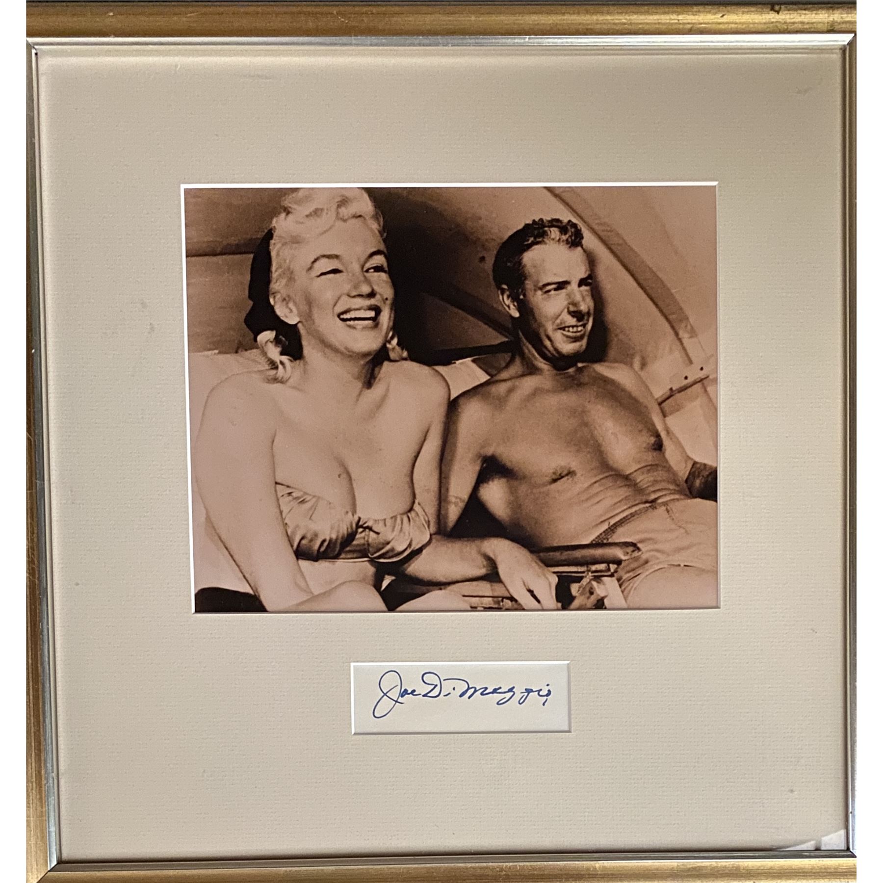 Joe DiMaggio original signature and photo with Marilyn Monroe. Framed and Matted. 16x16 inches