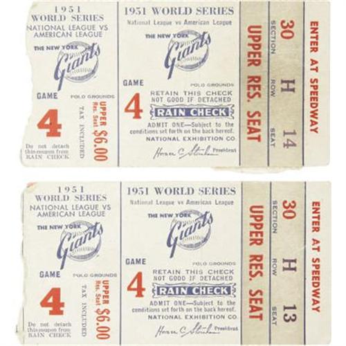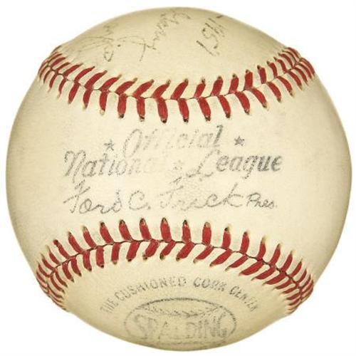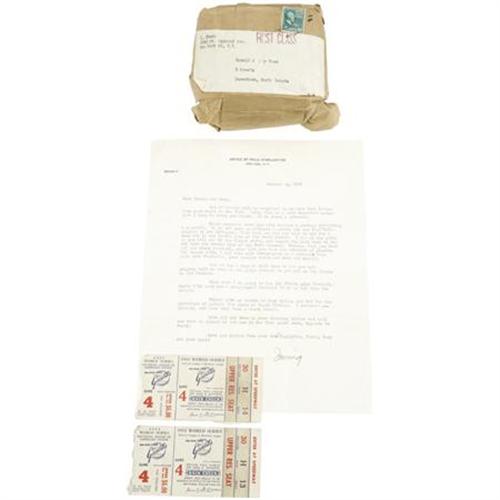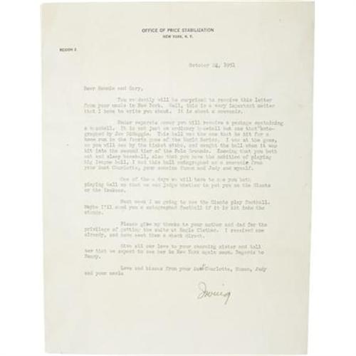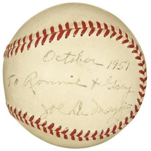<B>Joe DiMaggio's Final Home Run Baseball, Hit in Game Four of 1951 World Series.</B></I> The sweetest swing in baseball history was responsible for 369 home runs in Big League competition, with 361 coming during the regular season and the balance of eight dating to the Fall Classic. Here we present what is arguably the most significant of them all, the ball that recorded the 369th and final round-tripper for the man they called the Yankee Clipper. Just across the Harlem River from the stadium that he consecrated with thirteen seasons of Hall of Fame service, DiMaggio launched this ONL (Frick) delivered by pitcher Sal Maglie into deep left field to open up a four to one lead and move one step closer to ending the 1951 Giants' fairy tale story punctuated by Bobby Thomson's "Shot" on the same Polo Grounds field five days earlier.<BR><BR> Historic home run artifacts continue to capture the imagination of the collecting world unlike any other baseball collectibles, with Mark McGwire's 1998 record-setting ball and Babe Ruth's first Yankee Stadium home run bat the only two non-card lots to top one million dollars at auction. Surely it goes without saying that the final home run baseball from one of the most iconic figures in American sports carries tremendous historical import. The connection to this unforgettable Subway Series, which brought Big Apple legends DiMaggio, Mickey Mantle and Willie Mays together in combat for the only time, is just the icing on the cake.<BR><BR> Ironclad provenance is delivered in several forms. First, we have a typed, signed letter dated October 24, 1951 from the gentleman who caught the baseball to his nephews, making note of the gift. He writes, in part, "Under separate cover you will receive a package containing a baseball. It is not just an ordinary baseball but one that is autographed by Joe DiMaggio. This ball was the one that he hit for a home run in the fourth game of the World Series. I was at the game, as you will see by the ticket stubs, and caught the ball when it was hit into the second tier of the Polo Grounds..." And, sure enough, still keeping company with the letter and the baseball is a pair of adjacent ticket stubs in the "Upper Res. Seat" section of the fabled Manhattan ballpark. Amazingly, even the original packaging that delivered the baseball from lucky fan Irving Stein to his nephews in North Dakota has survived within this collection.<BR><BR> We must note that the autograph to which Mr. Stein refers is unfortunately not that of DiMaggio himself, but rather of a clubhouse worker ghost signing for the future Hall of Famer. This was quite common at the time, and seasoned autograph collectors are well aware that many Yankee team balls of the era bear a secretarial DiMaggio. Top autograph authenticator James Spence does confirm, however, that the "October 1951, To Ronnie & Gary, Joe DiMaggio" inscription is applied in vintage ink, and is no modern contrivance. While a genuine DiMaggio signature would be ideal, the clubhouse version does not in any way detract from the stature of this horsehide sphere in the book of baseball history. A fundamentally important artifact of our national game, worthy of placement within the finest of private collections. <I>LOA from James Spence Authentication.</B></I><BR><BR><b>Shipping:</b> Balls, Pucks, etc., Small (<a target="_blank" href="http://www.heritageauctions.com/common/shipping.php">view shipping information</a>)