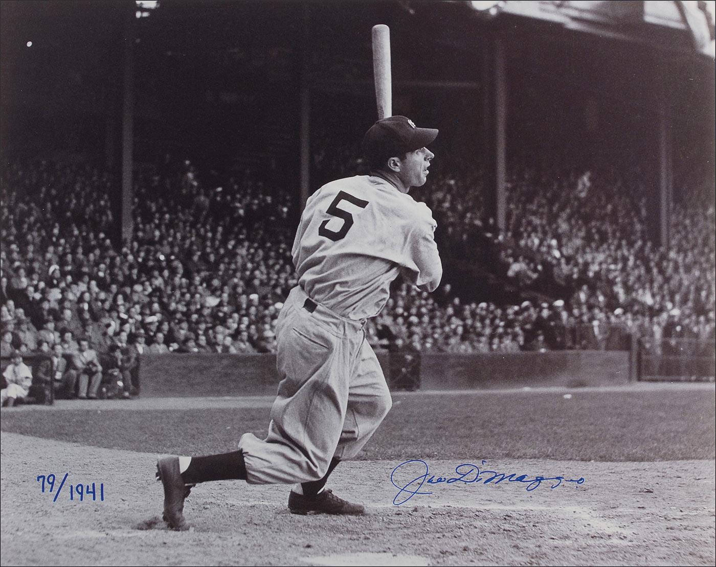 Satin-finish 20 x 16 photo of DiMaggio at the plate, signed in blue felt tip. In very fine condition. Accompanied by a certificate of authenticity from Score Board.