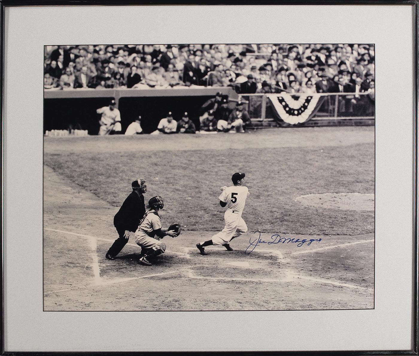 Satin-finish 20 x 16 photo of DiMaggio taking a swing in front of a capacity crowd, signed in blue felt tip. Matted and framed to an overall size of 24 x 20.25. In fine condition. Oversized.