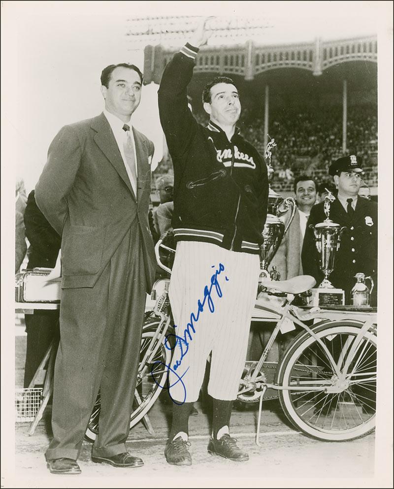 Glossy 8 x 10 photo of DiMaggio acknowledging the crowd at Yankee Stadium on Joe DiMaggio Day, signed in blue felt tip. In fine condition, with small binder dings to right edge.