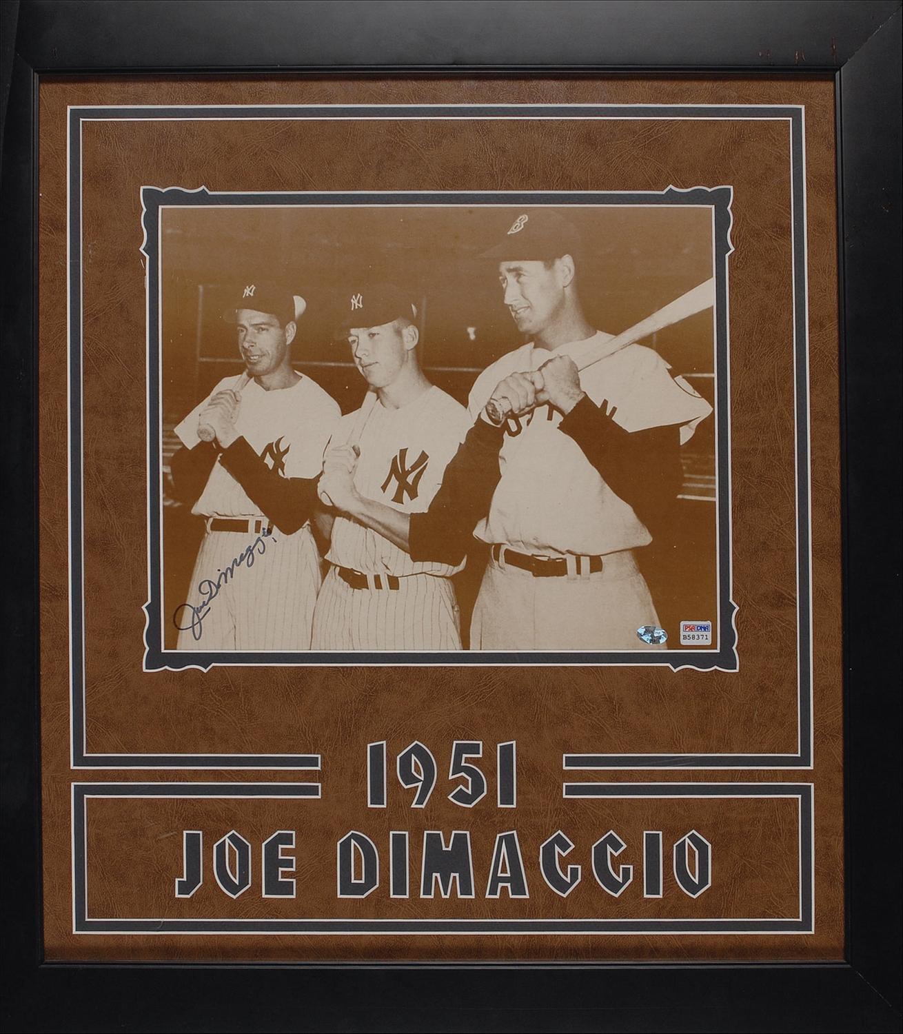 Matte-finish 13 x 10.5 photo of Joe DiMaggio, Ted Williams, and Mickey Mantle, signed in blue felt tip by DiMaggio. Elaborately double-matted in imitation leather and framed to an overall size of 23.25 x 25.25, In fine condition with a PSA/DNA authentication label affixed to the photo. Accompanied by a full letter of authenticity from PSA/DNA. Oversized.