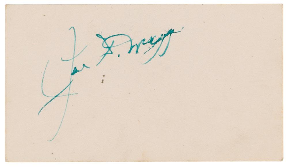 Vintage fountain pen signature, “Joe DiMaggio,” on an off-white 3.5 x 2 card. In fine condition, with some light bleeding to signature from excess ink flow.