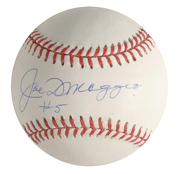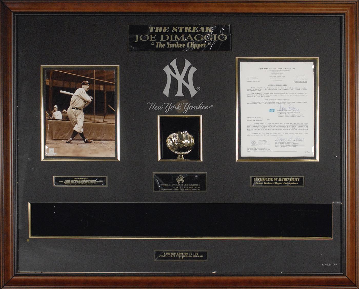 Limited edition Louisville Slugger Joe DiMaggio model baseball bat, #17/56, signed on the barrel in blue felt tip, “Joe DiMaggio, Yankee Clipper”; and an official Rawlings American League baseball, signed in blue ballpoint on the sweet spot, “Joe DiMaggio #5.” Both items come with their original 42 x 34 shadowbox and frame, with a photo of DiMaggio, several plaques, and a certificate of authenticity from DiMaggio’s long time friend and attorney Morris Engelberg from Yankee Clipper Enterprises. In fine condition. A fitting tribute to one of baseball’s most impressive records, DiMaggio’s 56-game hitting streak…a feat which many say will never be broken.
